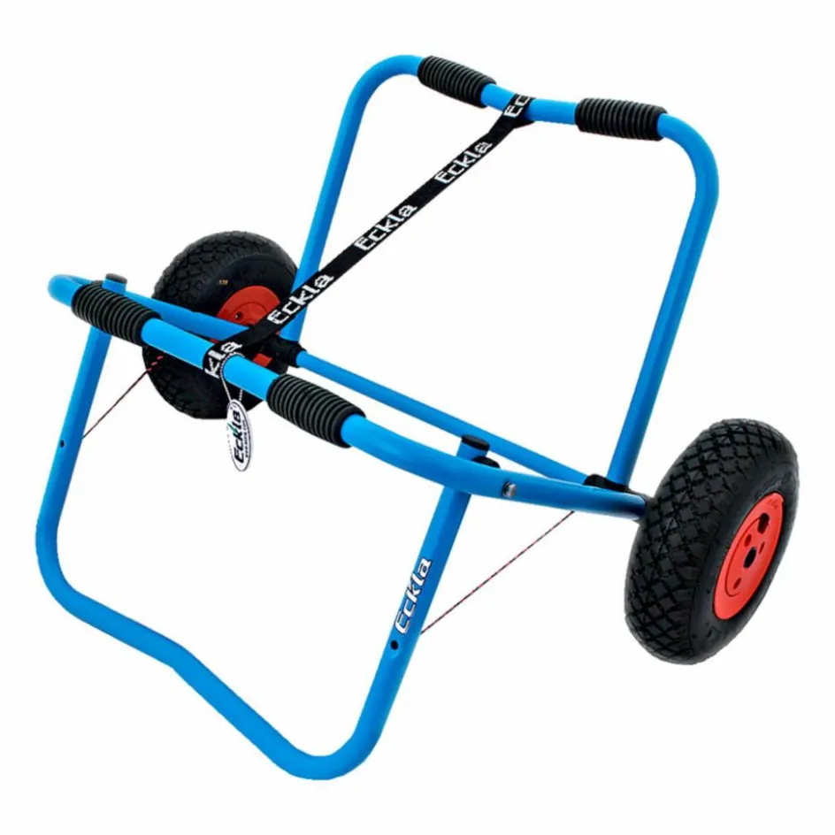 Stabiler Bootswagen für den Transport von Kanadiern. Der Kanutransportwagen ist mit walzgelagerten Rädern ausgerüstet, die leichtgängig über Stock und Stein rollen.