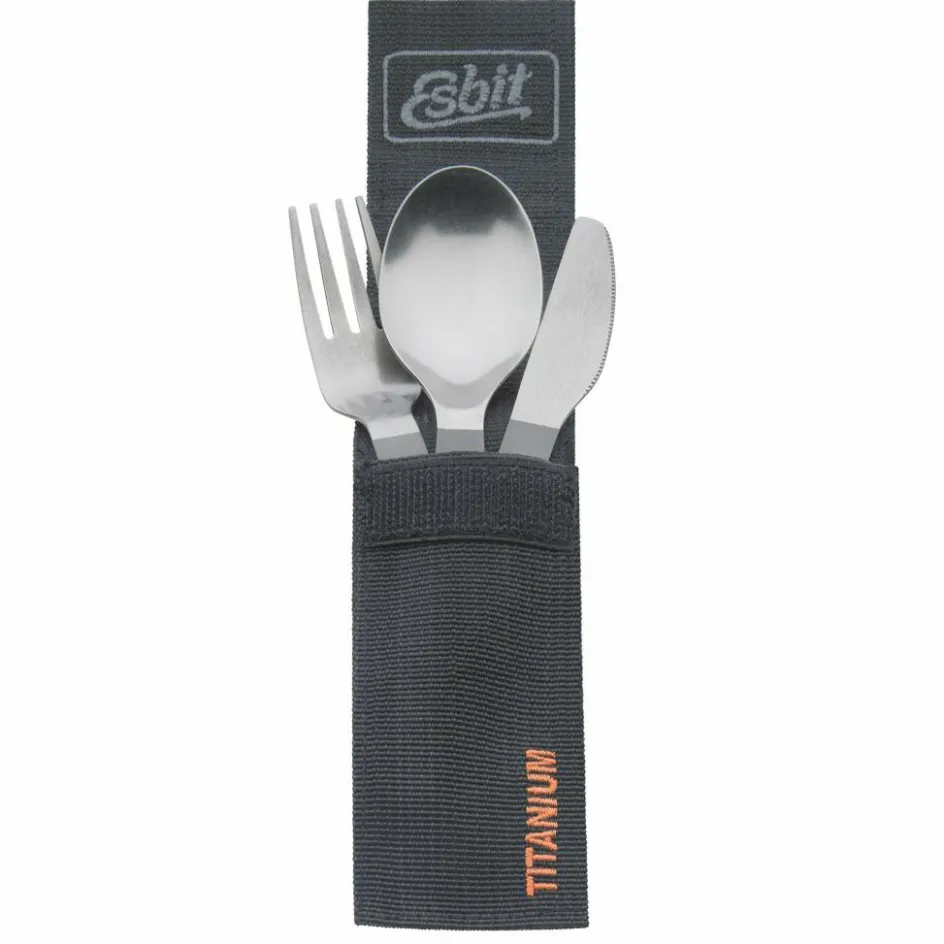 3-teiliges Titanbesteck, bestehend aus Messer, Gabel und Löffel. Ein kleiner Karabiner fixiert die Besteckteile. Die Nylon-Tasche mit Klettverschluss hat auf der Rückseite eine Gürtelschlaufe.
