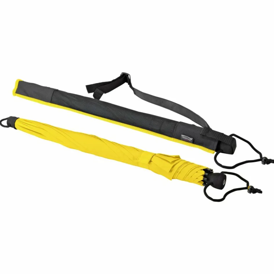 Für extreme Belastungen konzipierter Regenschirm, der selbst einer Querbelastung von 75 kg stand hält. Zum Einsatz kommt ein High-Density-Glasfasergestell und Polyamid-Gewebe mit Doppelnähten.