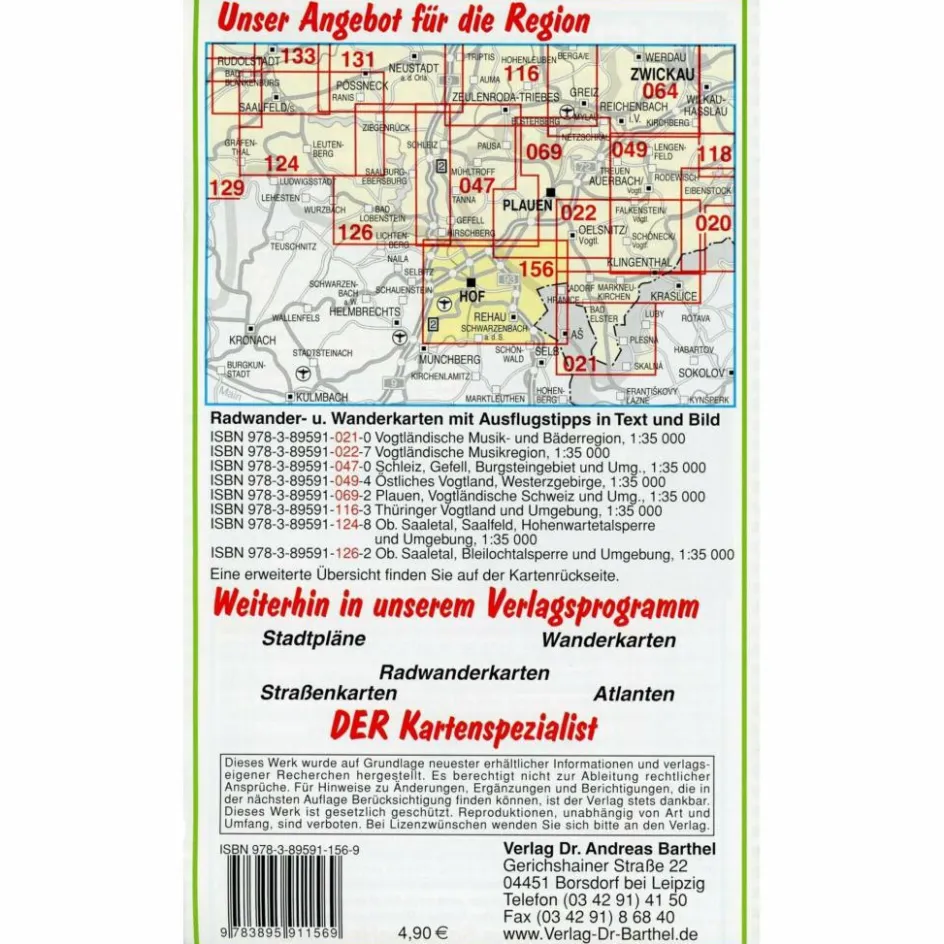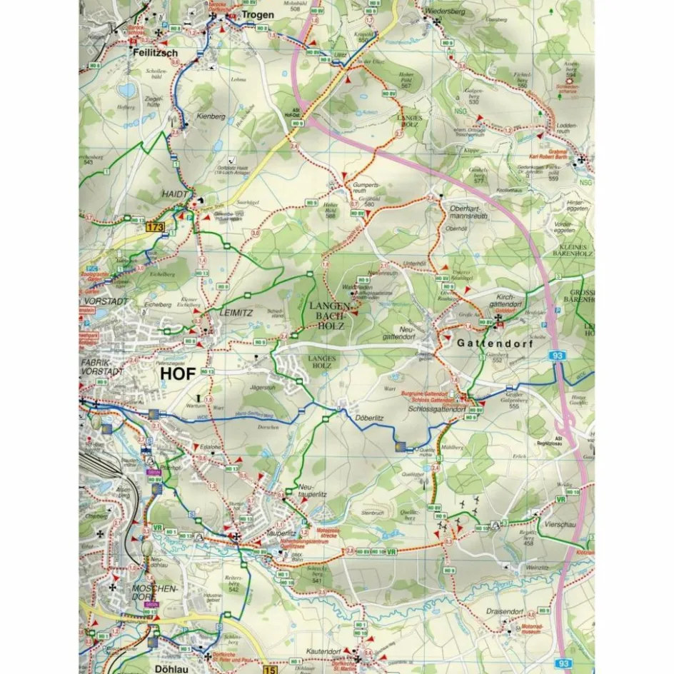 Mit Straßennamen zur besseren Orientierung, farbig hervorgehobenen Ausflugszielen, Sehenswürdigkeiten der Umgebung in Text und Bild und alle regionalen und überregionalen Wander- und Radwanderwege sowie ausgewiesene Radtourenvorschläge mit Entfernungsangabe in Kilometern.Mit Verlauf des Radwanderweges „Bayerisches Vogtland“.Mit wetterfester Klarsicht-Schutzhülle.