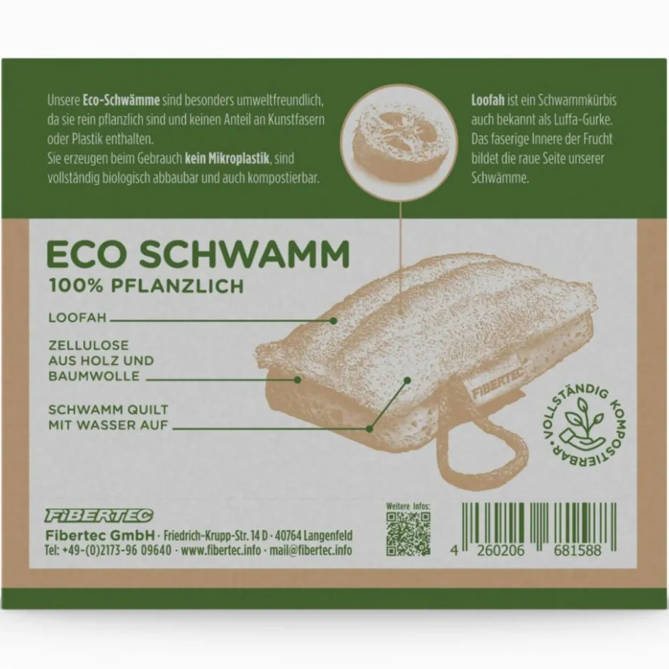 Alle Teile des Schwamms sind biologisch abbaubar. Während die weiche Seite aus 100 % pflanzlicher Zellulose besteht, ist die feste Seite aus der Loofah-Gurke hergestellt. Garn, Schlaufe und Label bestehen hingegen aus 100 % Baumwolle. Die Schlaufe eignet sich hervorragend, um den Schwamm nach der Nutzung zum Trocknen aufzuhängen.