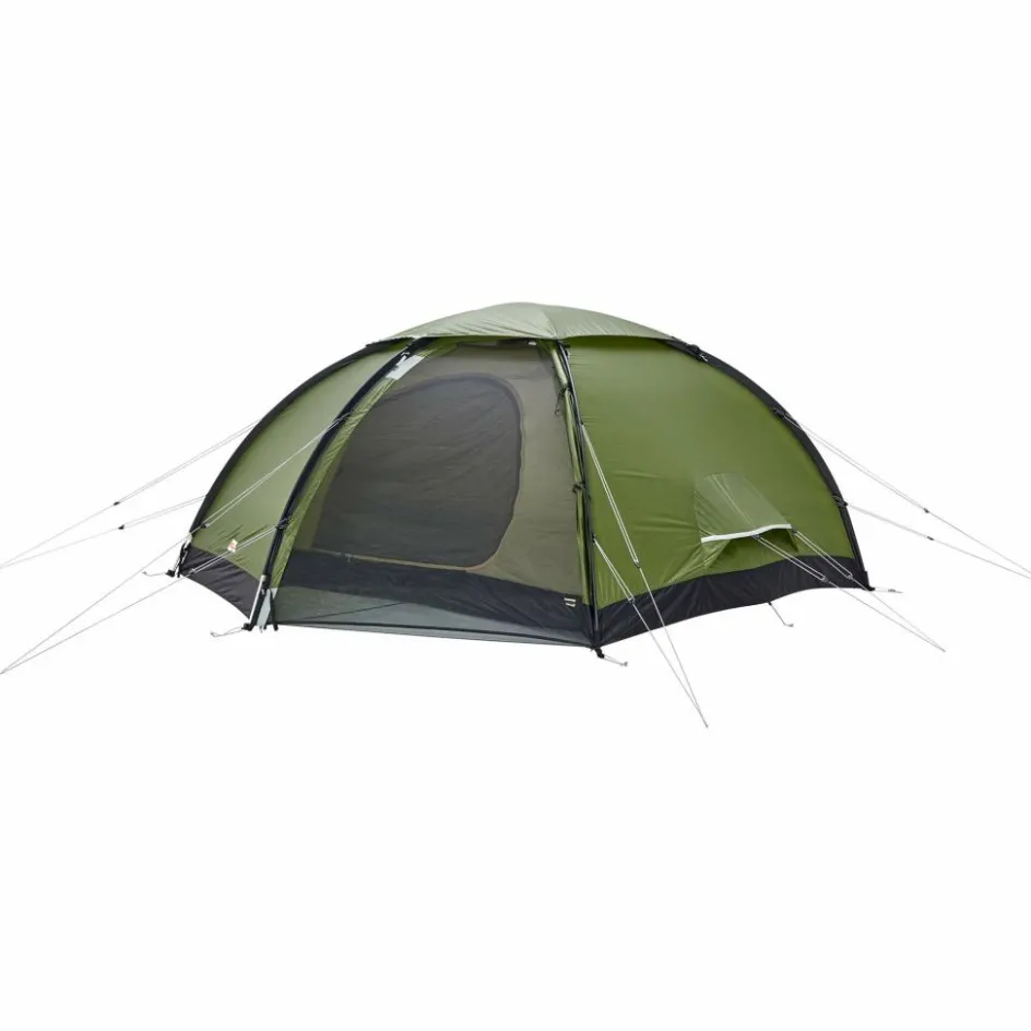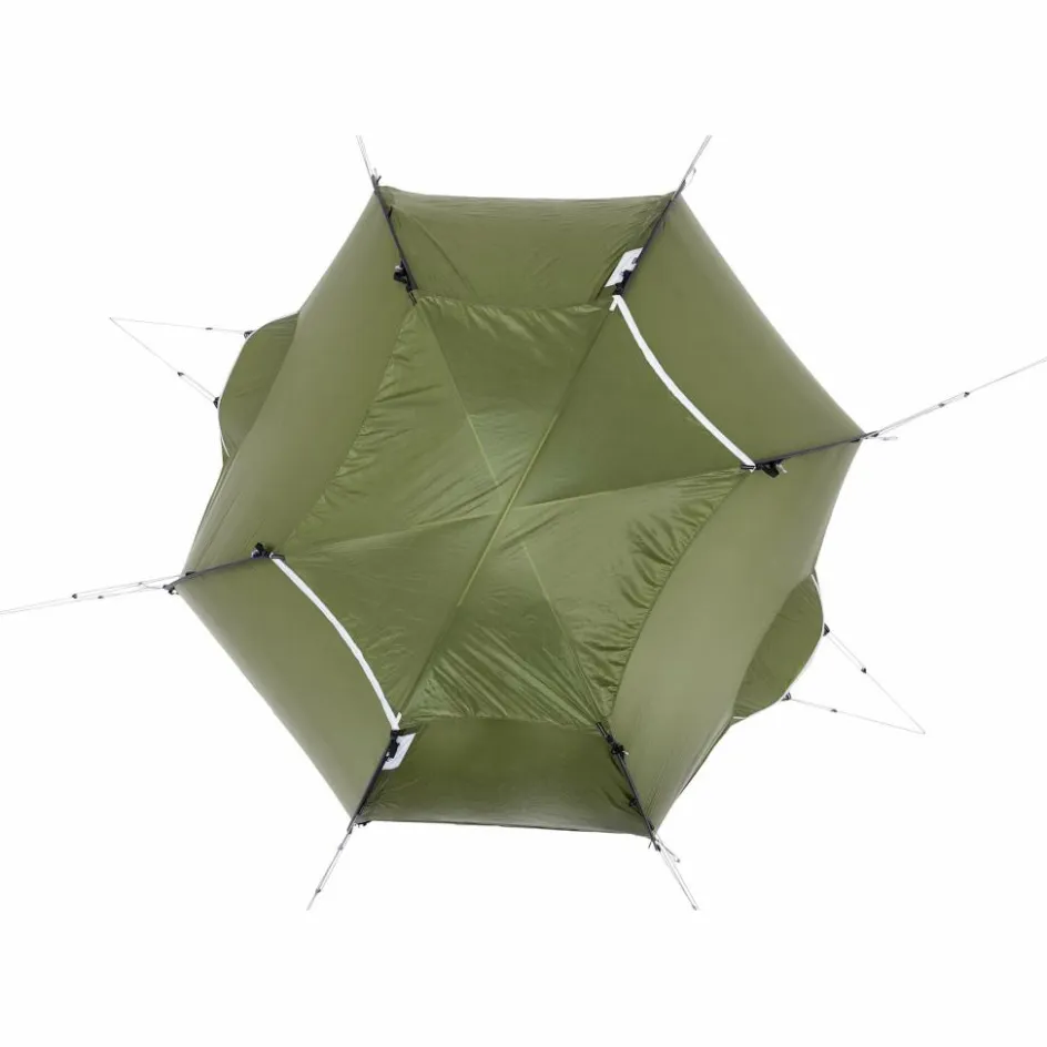 Das Außenzelt ist freistehend. Es sind bei milder Witterung also keine Heringe zum Aufbau notwendig und das Zelt kann beliebig oft umgestellt werden, bis ein geeigneter Standplatz gefunden ist. Falls die reflektierenden Abspannleinen doch benötigt werden, so lässt sich das Keb Dome durch Einsatz der langen Leinen und Doppelspannern selbst mit vergrabenen Skiern oder Schneeschuhen abspannen.