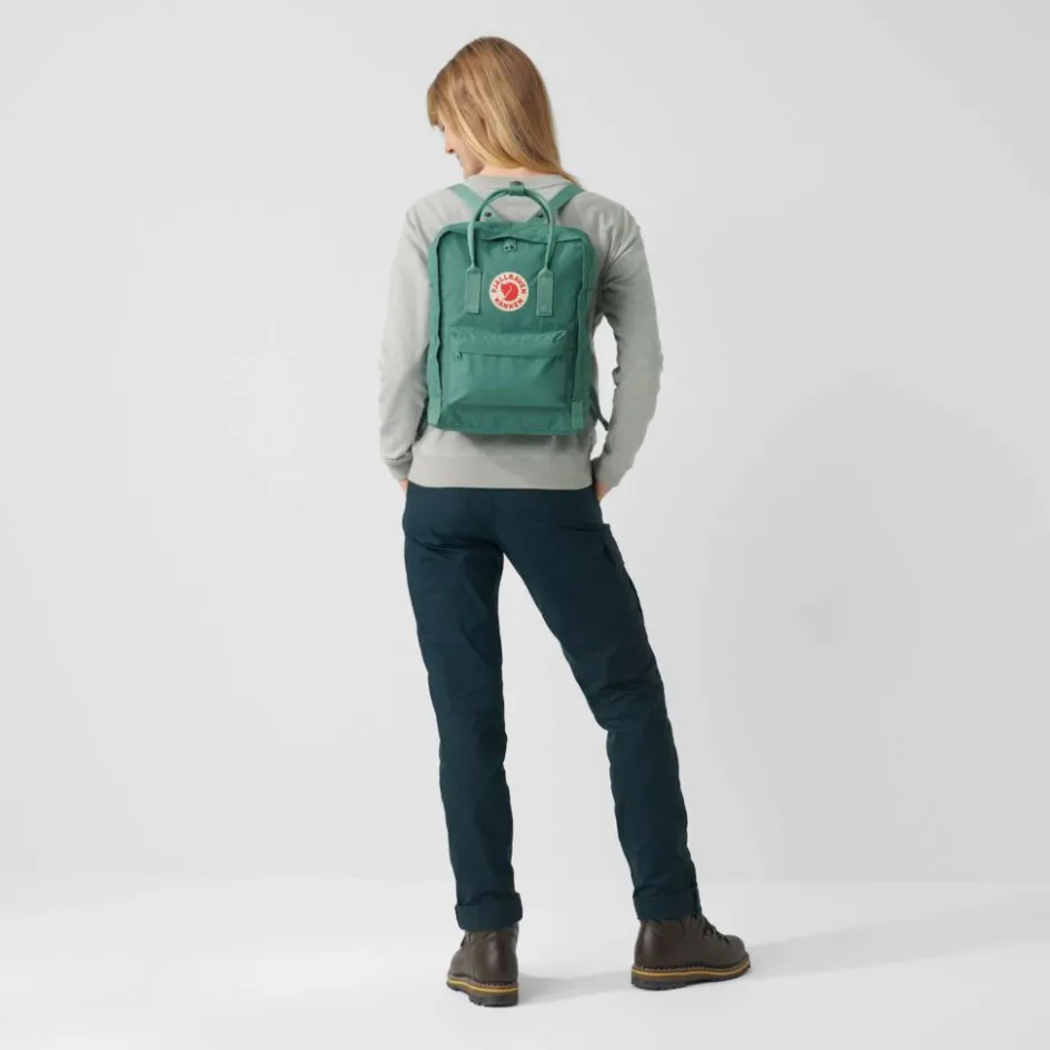 Der Kanken wird aus Fjällrävens Vinylon F gefertigt. Dieses Material quillt bei Feuchtigkeit wie eine Naturfaser auf und macht das Gewebe wasserabweisend. Eine Beschichtung ist dadurch überflüssig. Ein weiterer Vorteil: Diese Fähigkeit des Gewebes bleibt ein ganzes Kanken-Leben lang erhalten.