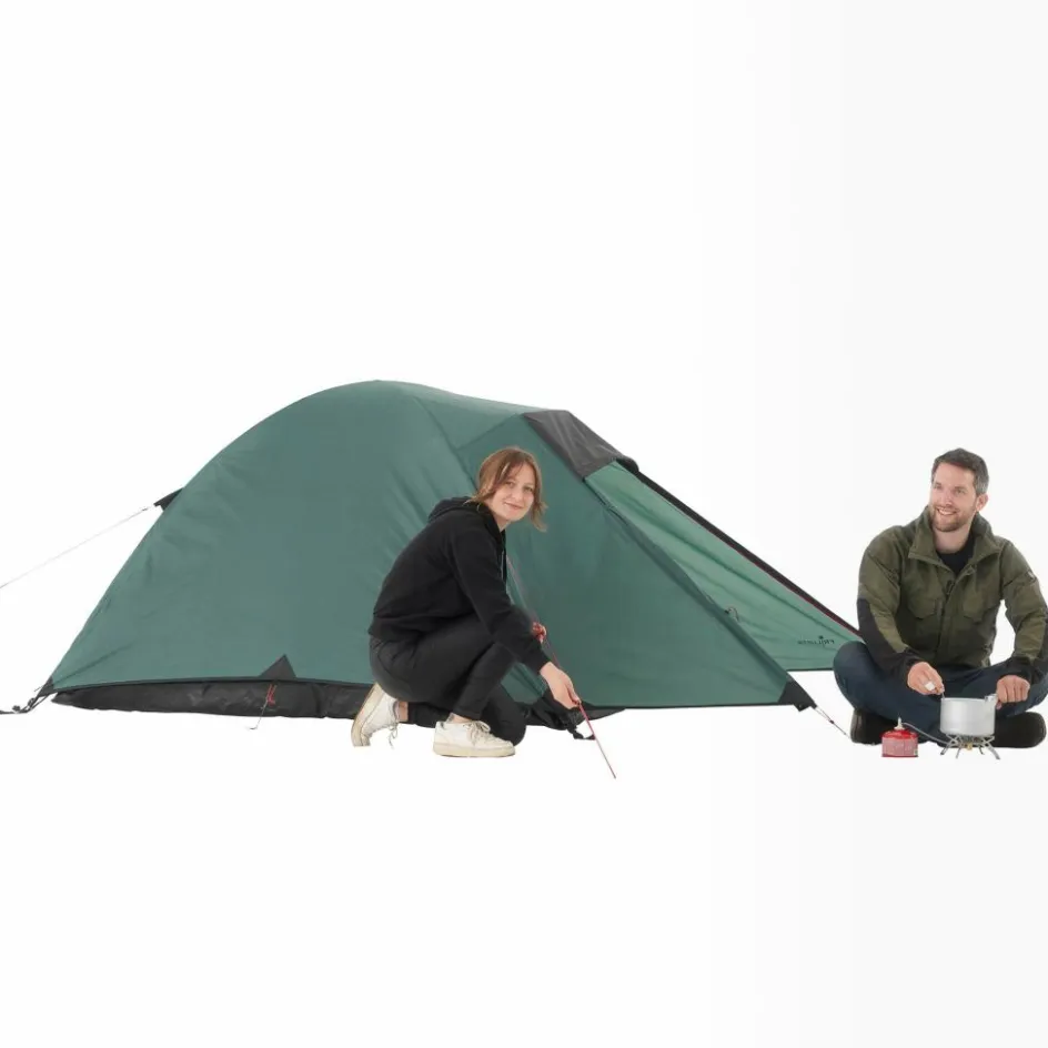 Günstiges Einsteigerzelt für zwei Personen, das sich ideal für erste Wanderungen und andere Outdooraktivitäten eignet. Der Innenraum ist großzügig bemessen und bietet zwei Personen ausreichend Platz.