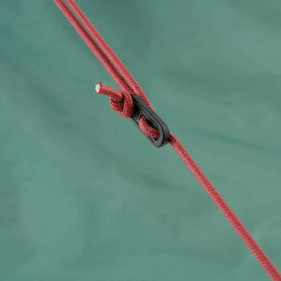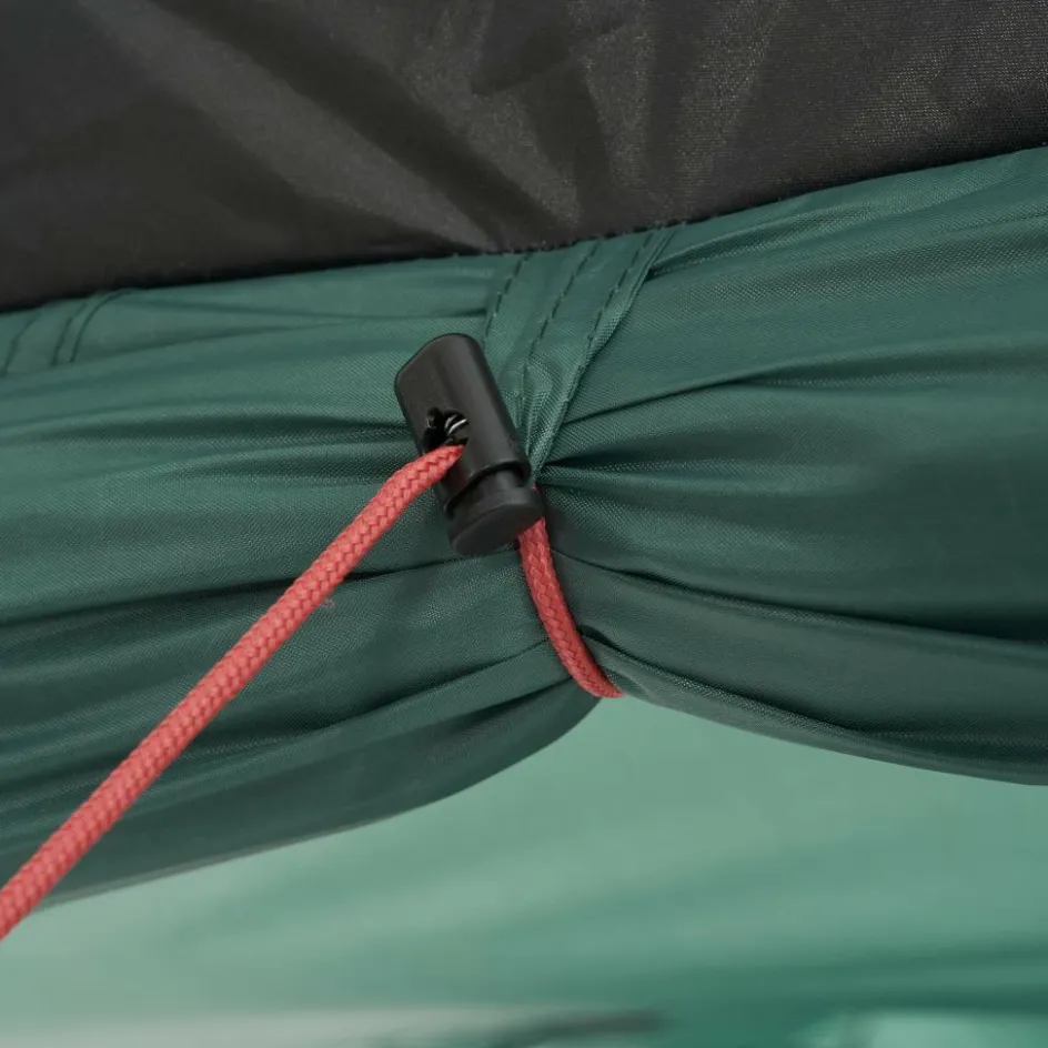 In der Apsis ist Platz für Ausrüstung oder einen kleinen Tisch mit Stühlen. Bei schönem Wetter lassen sich alle drei Eingänge aufrollen oder mit den im Lieferumfang enthaltenen Aufstellstangen aufstellen. Das Aufstellen sorgt nicht nur für besseres Klima und schönen Ausblick, sondern dient gleichzeitig als Sonnenschutz. Jede Tür verfügt über ein eigenes Fenster, das mit Stoff verschlossen werden kann.