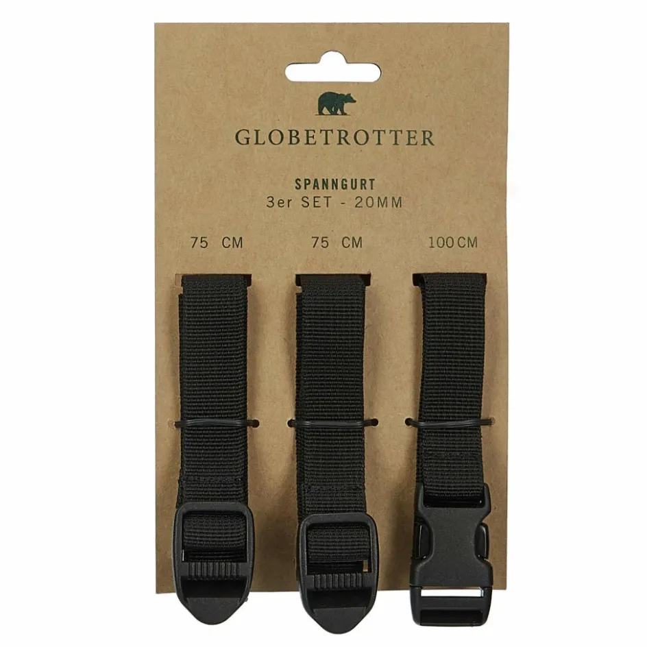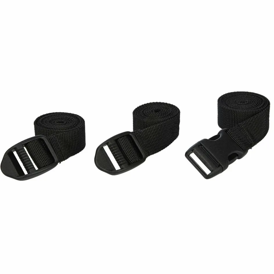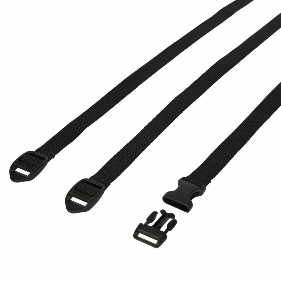Zum Set gehören zwei 75 cm lange Spannriemen mit Leiterschnalle und ein 100 cm langer Gurt mit Blitzverschluss. Sie eignet sich zum Sichern leichter Ausrüstungsgegenstände. Die Gurte sind 20 mm breit.