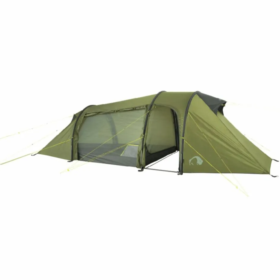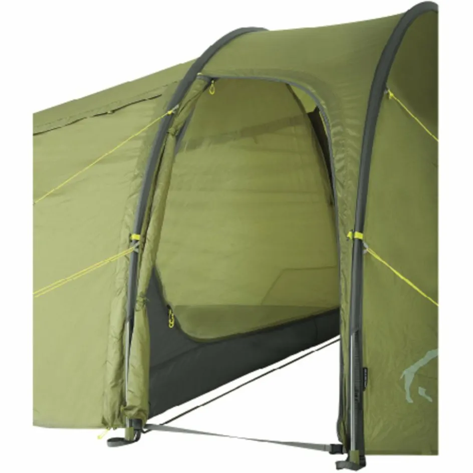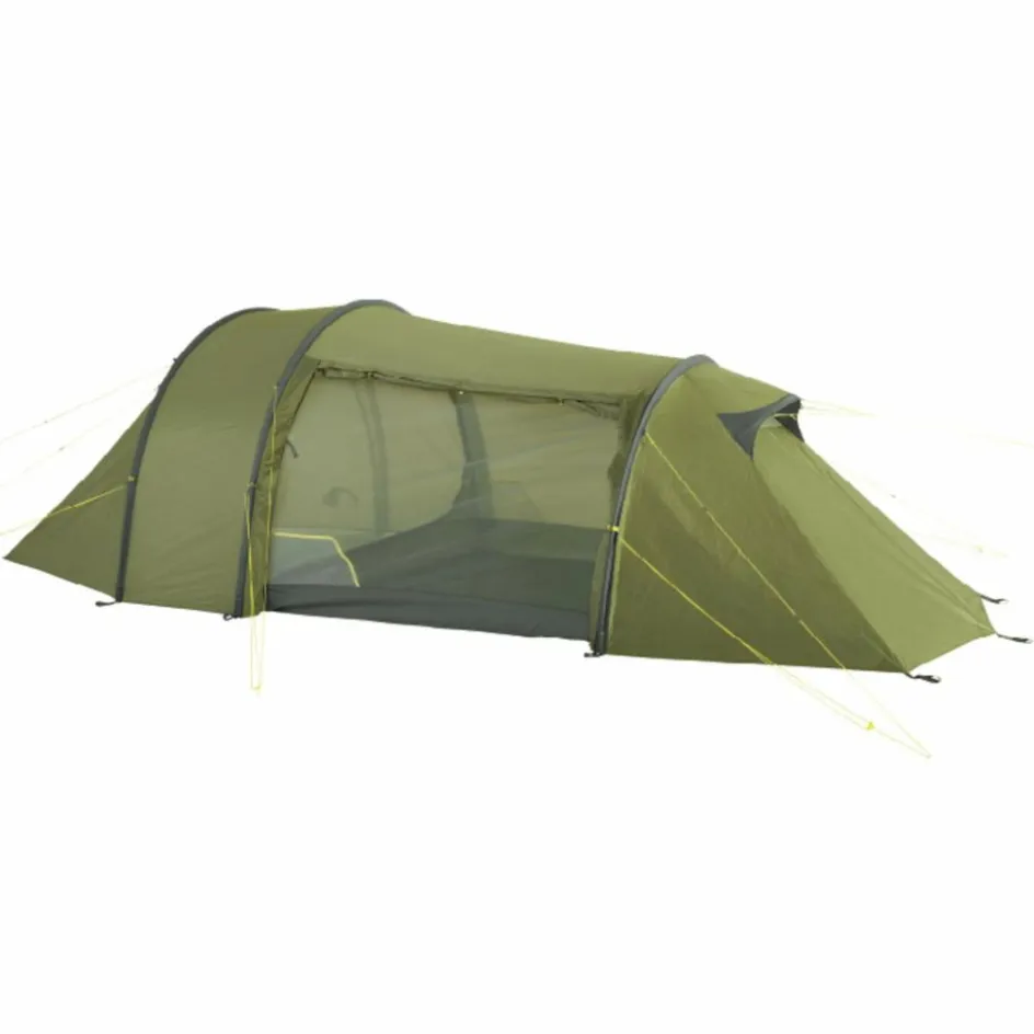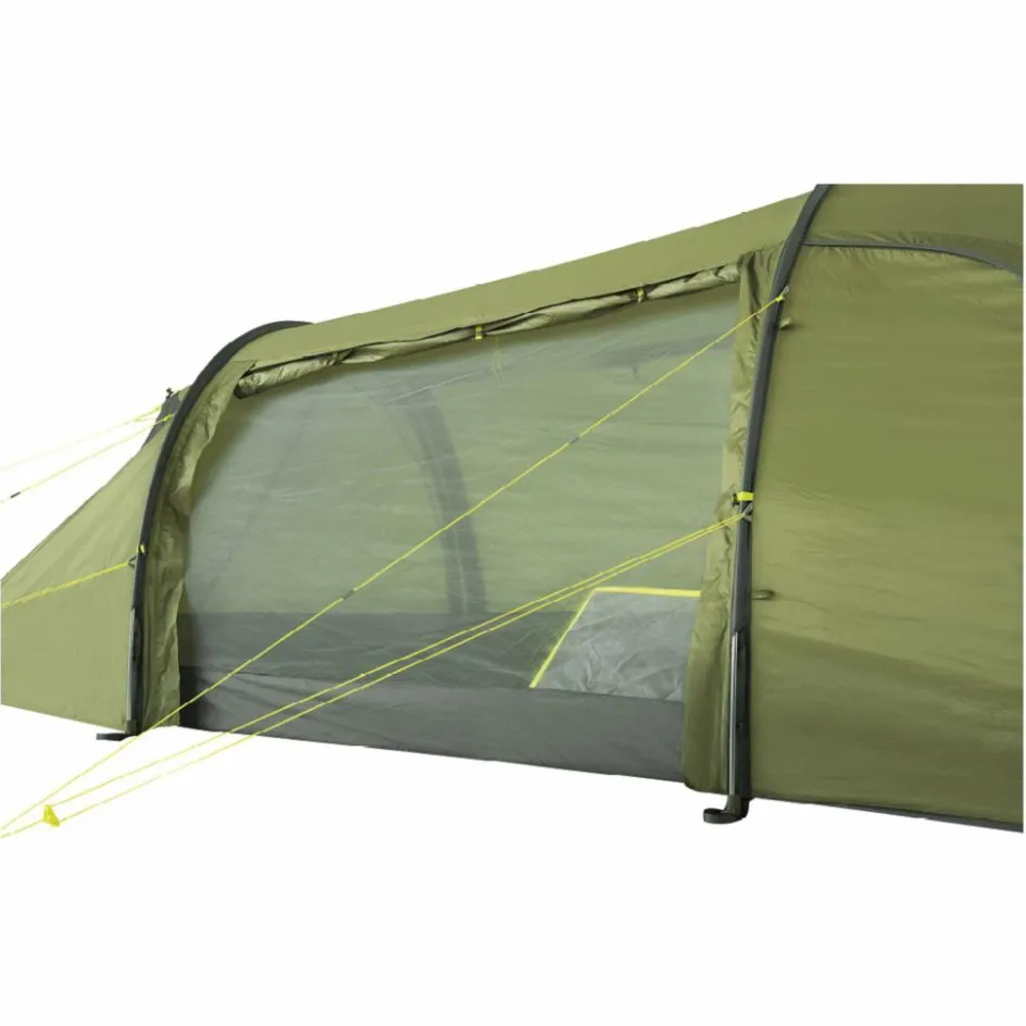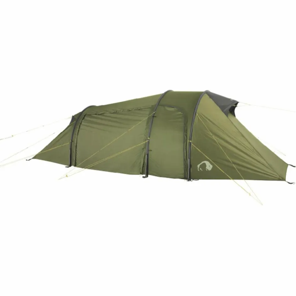 Das 3-Personen-Zelt wird mit drei Gestängebögen aus leichtem, bruchfestem Aluminium aufgestellt. Der hintere Bogen ist verkürzt, wodurch Material und Gewicht eingespart werden. Durch die Koppelung von Innen- und Außenzelt gestaltet sich der Aufbau sehr einfach. Das Innenzelt kann selbstverständlich auch ausgehängt werden.