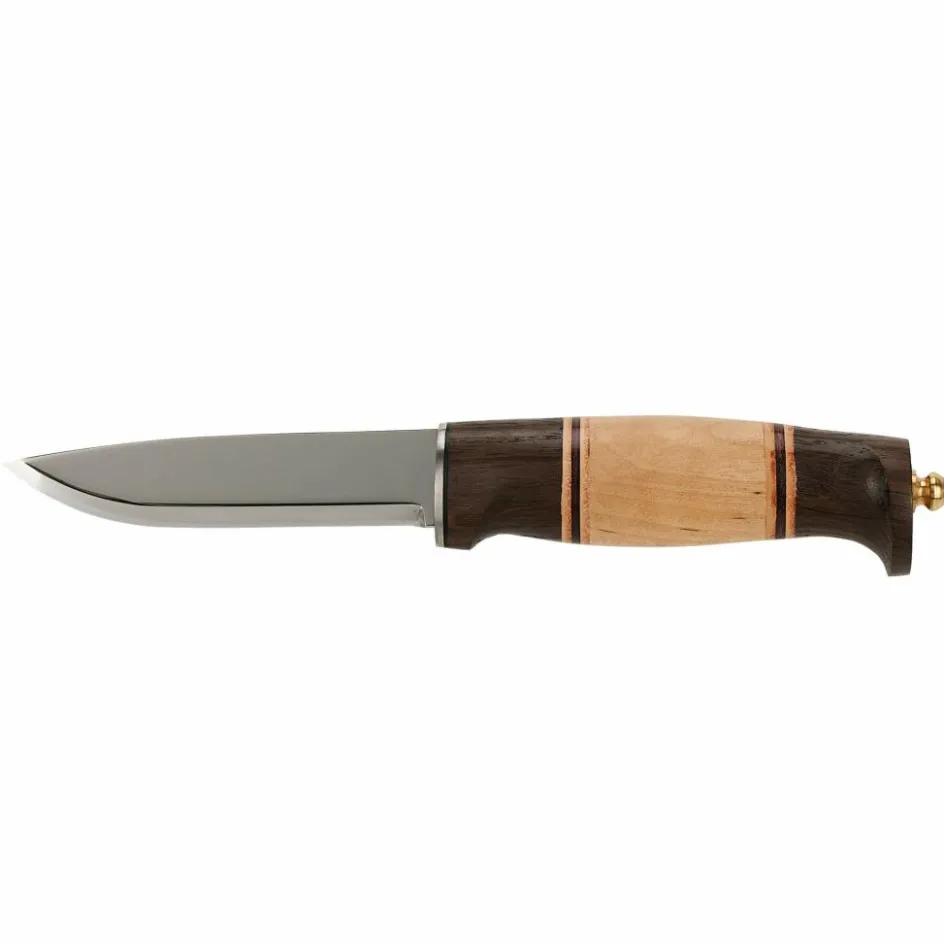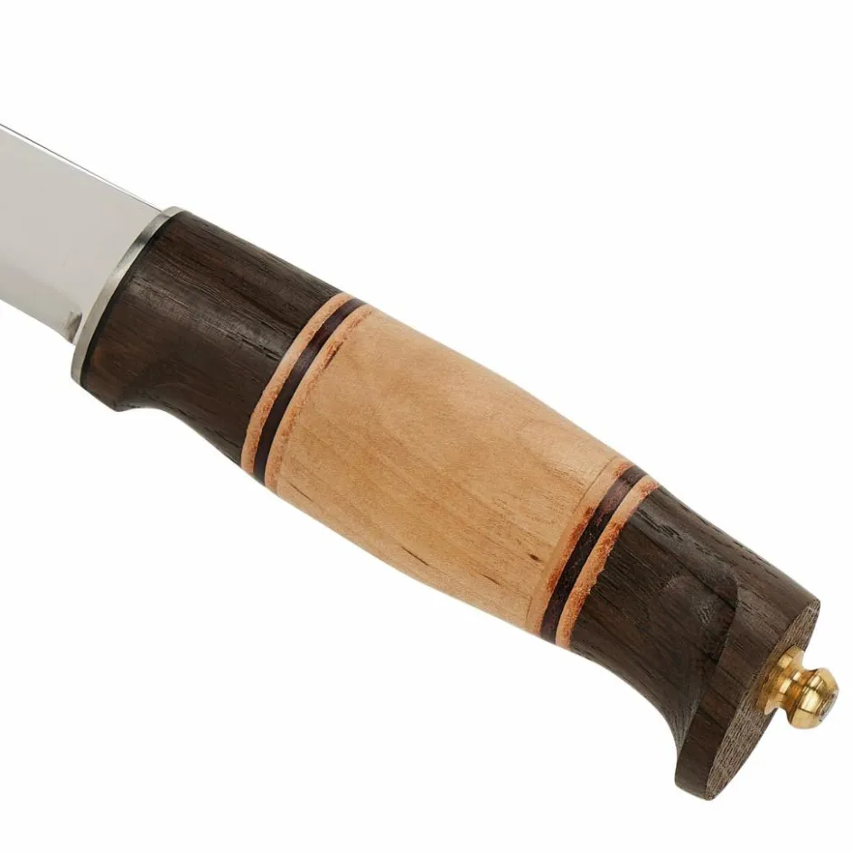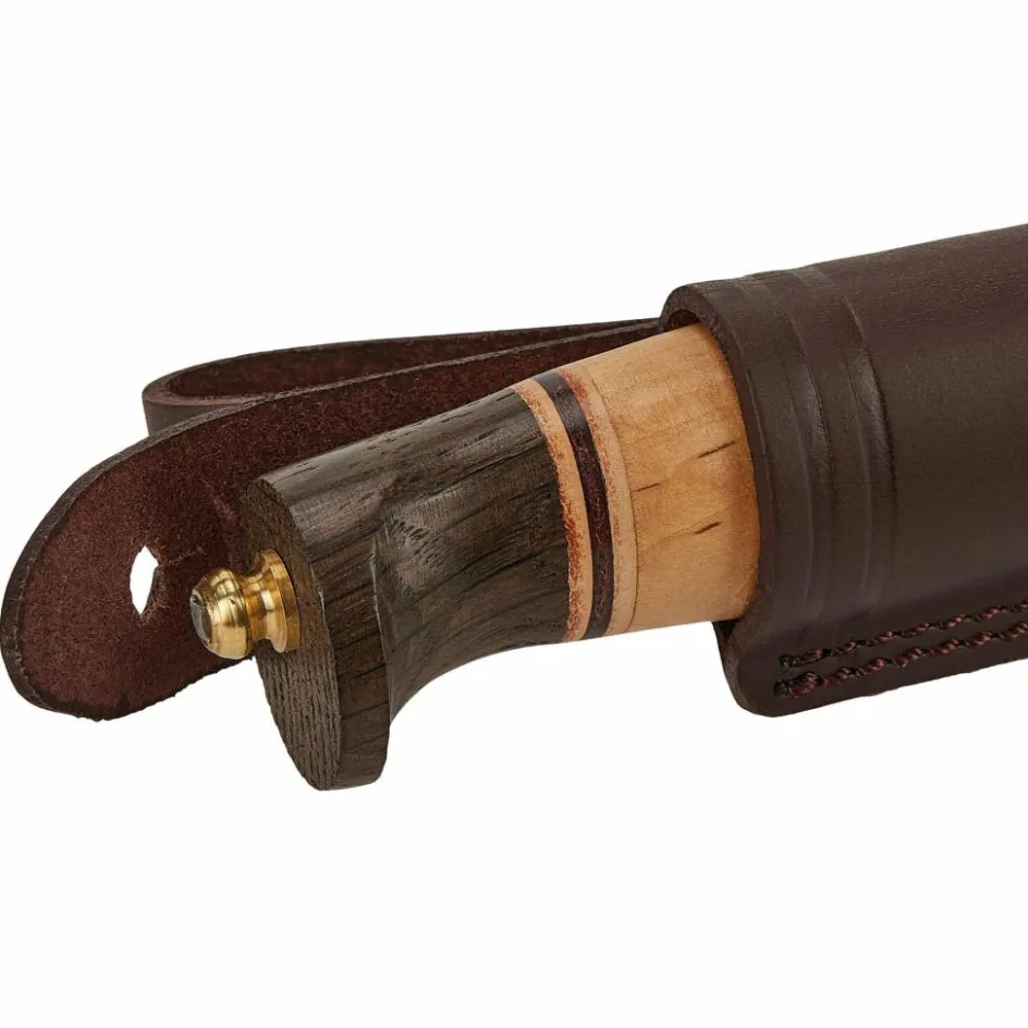 Vier Zutaten machen dieses skandinavische Jagdmesser zu einem echten Leckerbissen: Maserbirke, Eiche, Leder und die spiegelblank polierte Klinge aus H3LS-Stahl.