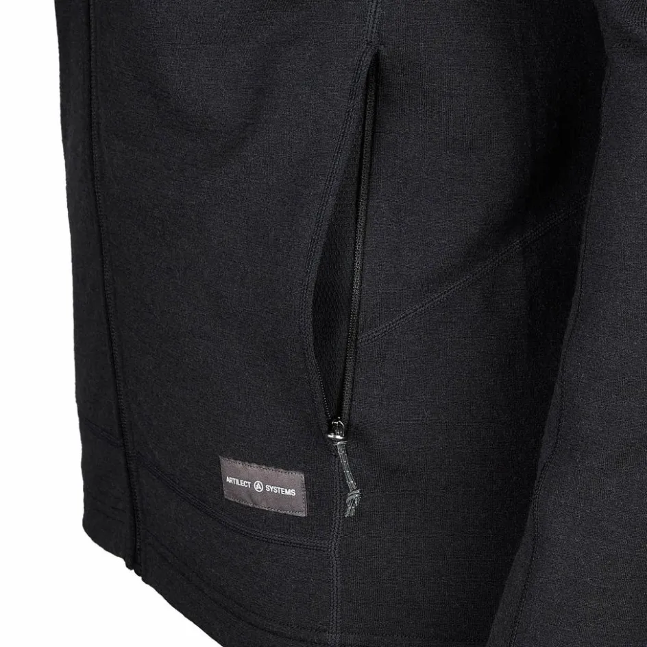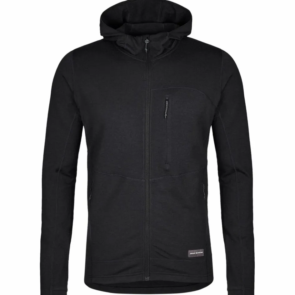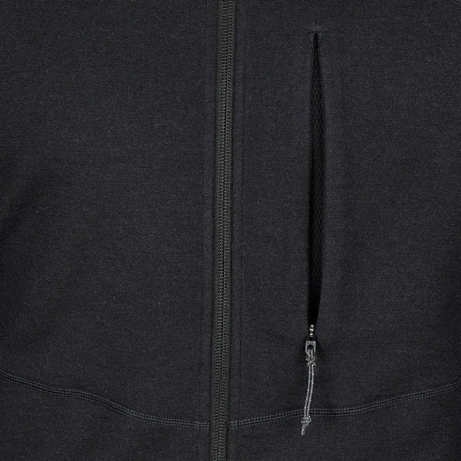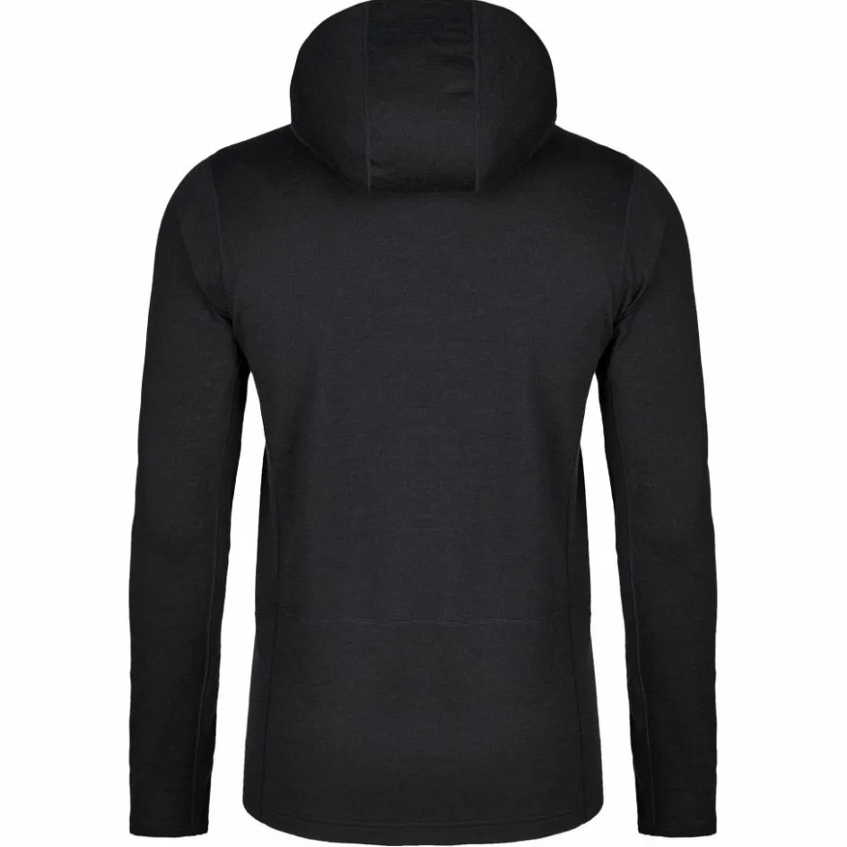 Der Hoodie ist aus Nuyarn hergestellt. Dabei handelt es sich um ein Garn aus feiner Merinowolle, die in einem besonderen Spinnverfahren mit einem Kern aus Nylon versehen wurde. Nuyarn trocknet fünfmal schneller als reine Merinowolle, ist sehr strapazierfähig und hoch elastisch. Gleichzeitig blieben die feuchtigkeitsleitenden, temperaturregulierenden und geruchshemmenden Eigenschaften, die Wolle von Natur aus besitzt, erhalten. So sorgt der Hoodie bei verschiedenen Aktivitätsleveln für volle Bewegungsfreiheit und ein angenehmes Körperklima.