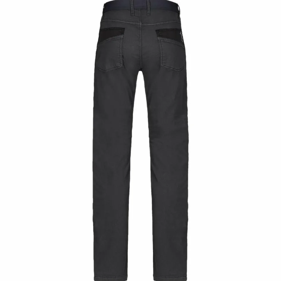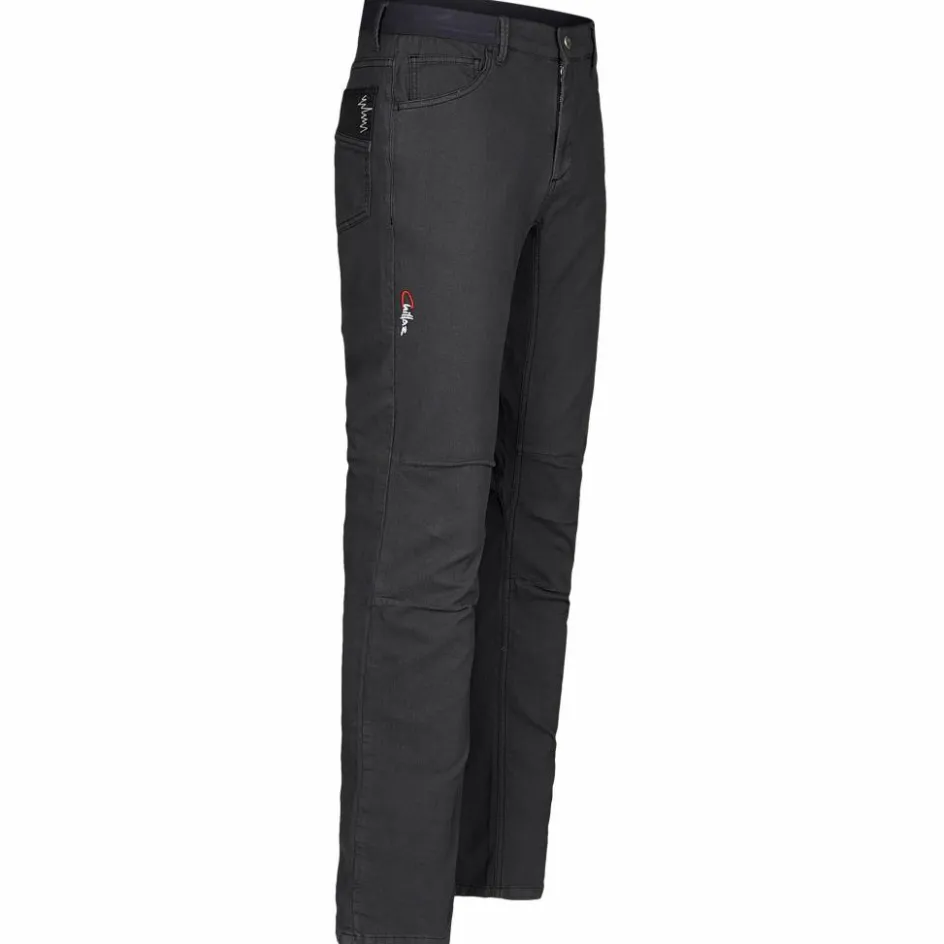 Die Hose hat den Schnitt einer klassischen Five-Pocket und wird per Knopf und Reißverschluss geschlossen. Dank des elastischen Zwickels im Schritt bietet die Hose auch bei extremen Moves absolute Bewegungsfreiheit. Die Knie sind leicht vorgeformt. Der elastische Bund ist besonders flach verarbeitet, sodass er unter dem Klettergurt nicht aufträgt.