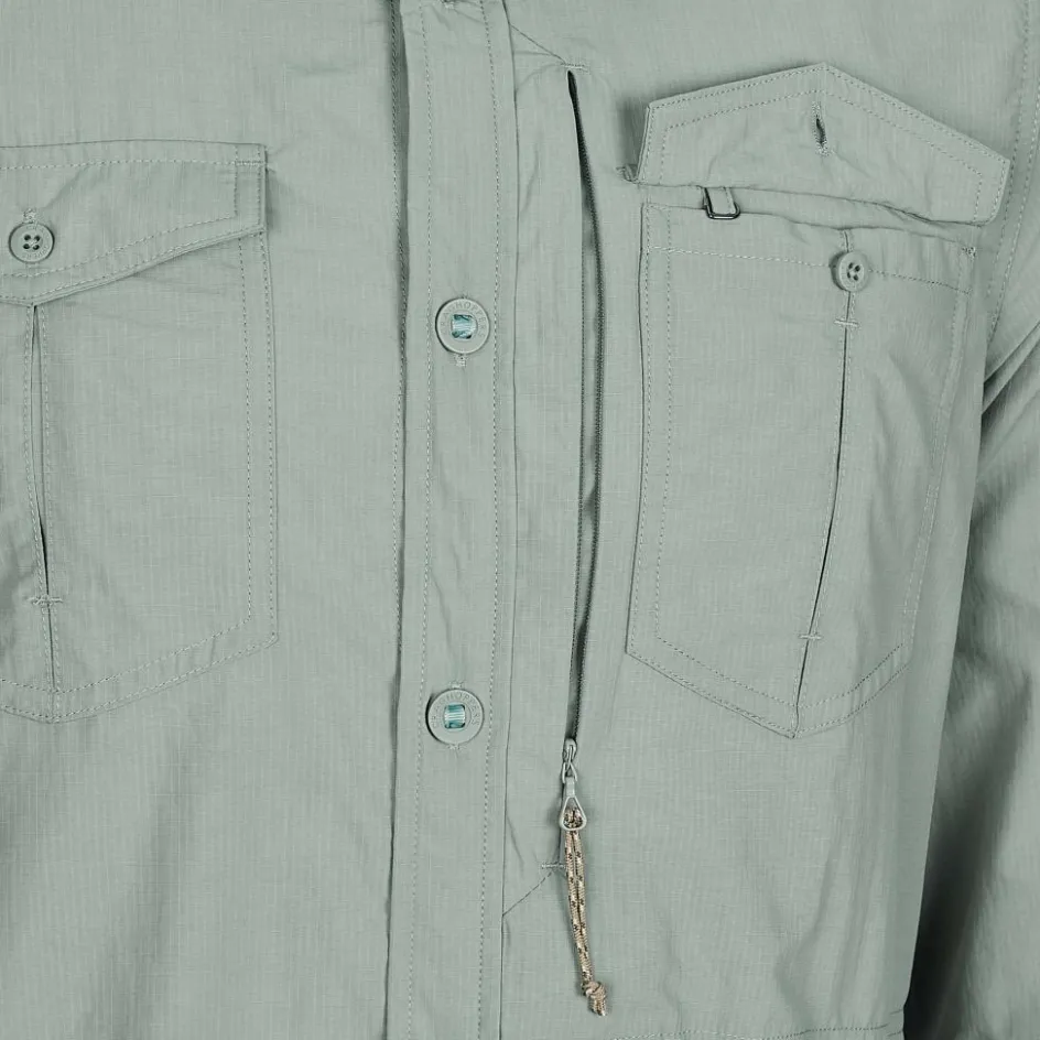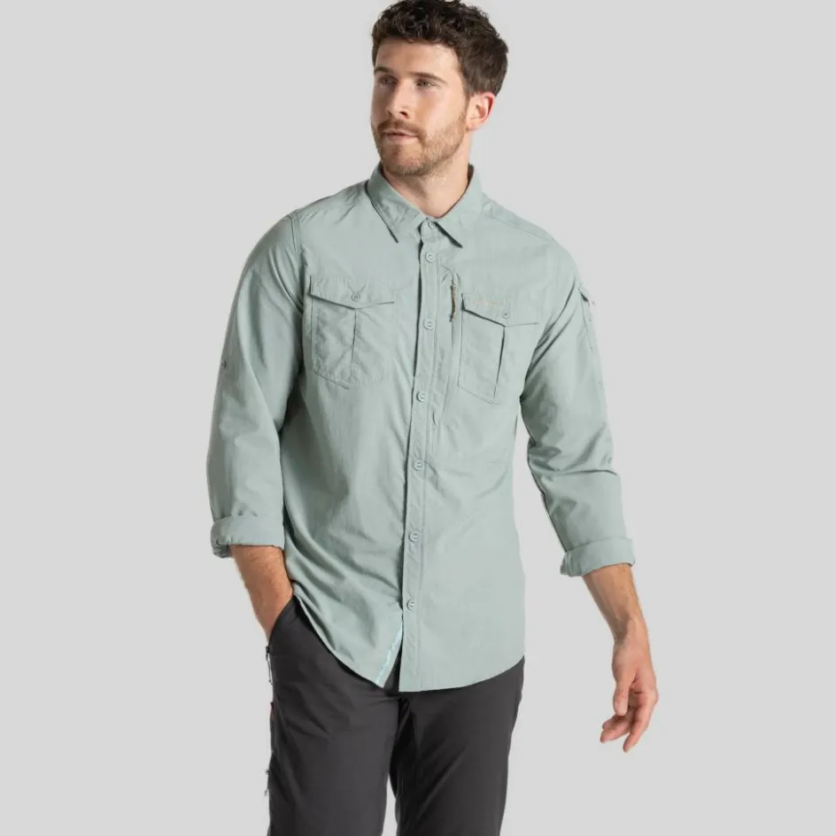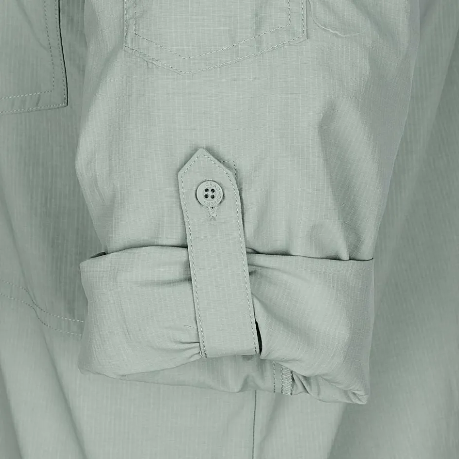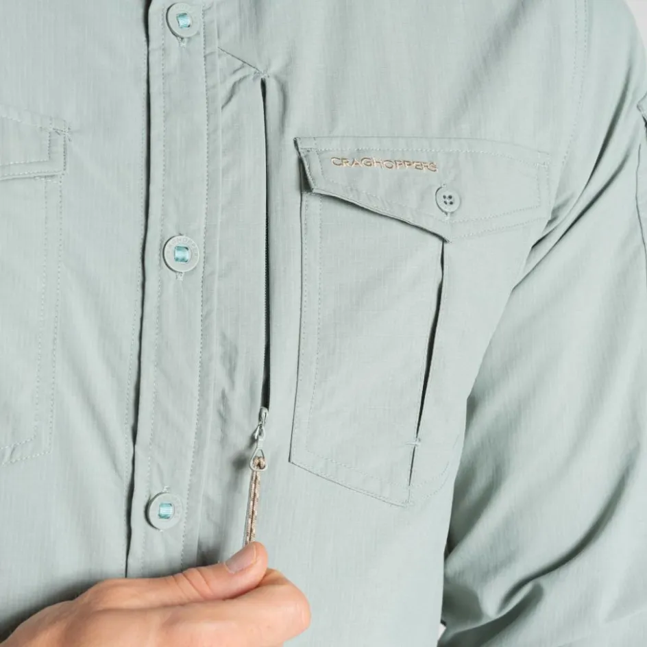 Die Ärmel des Langarmhemds lassen sich ganz einfach zum Kurzarm aufrollen und mit Lasche und Knopf fixieren. Der klassische Kragen kann zum Schutz vor der Sonne doppelt ausgeklappt werden. Für Stauraum sorgen einige Taschen. Eine lässt sich sogar durch einen kleinen Karabinerhaken verschließen.