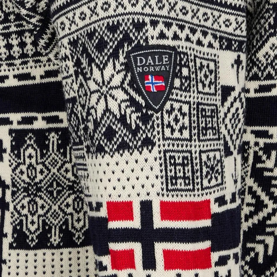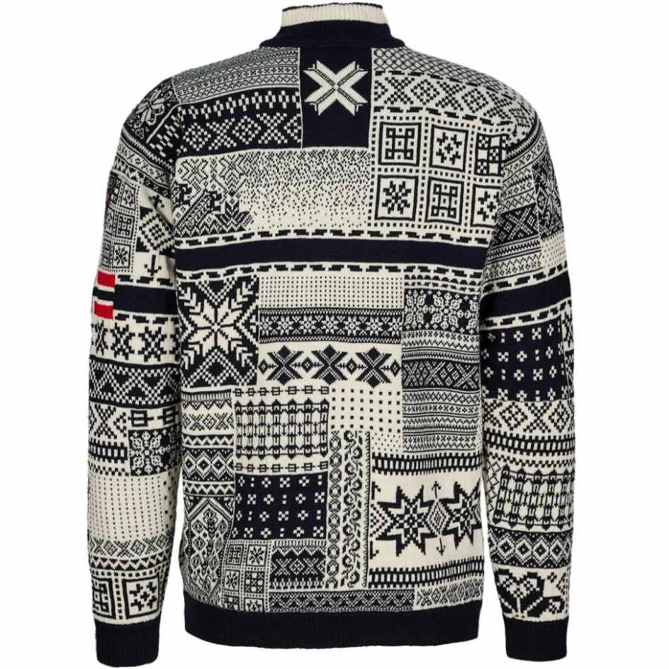 Der kurze Stehkragen ist mit weicher Merinowolle gefüttert und schenkt in den ruhigen Momenten Behaglichkeit. Der viertellange Reißverschluss hingegen sorgt für individuelle Belüftungsmöglichkeiten. Dale of Norway stellt seit 1956 die offiziellen Wollpullover für das norwegische Olympiateam. In diesem Sweater vereinen sich die Designs aller 18 Teampullovern der vergangenen Spiele.