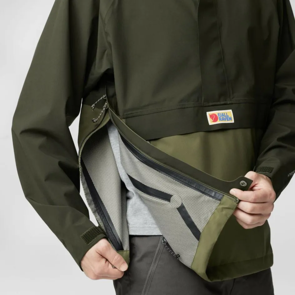 Gerade im Alltag ist ein Anorak superschnell übergeworfen und bietet dir viel Schutz und wenig Angriffsfläche für Wind und Regen. Der großzügige Schnitt ermöglicht es dir, warme Fleece– oder Isolationsjacken unter den Anorak zu schichten – superflexibel! Für die richtige Belüftung sorgen zwei seitliche Reißverschlüsse, davon ist einer ein Zwei-Wege-Reißverschluss, damit du dosiert Frischluft an deinen Körper lassen kannst. Gleichzeitig kannst du mit Hilfe von Druckknöpfen den Saum unten zusammenhalten, damit der Anorak nicht unkontrolliert umherflattert. Die große Brusttasche mit Mesh-Innenfutter fungiert als Stauraum für deinen Kleinkram wie auch als Packbeutel für den Anorak selbst.