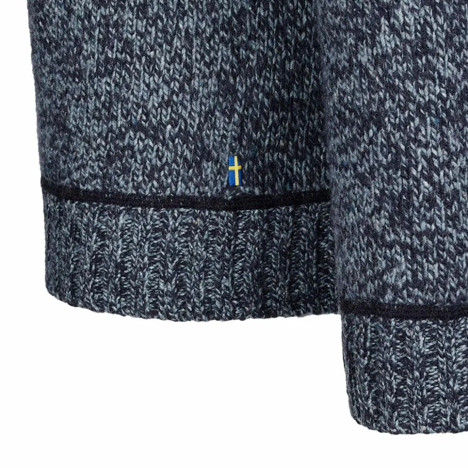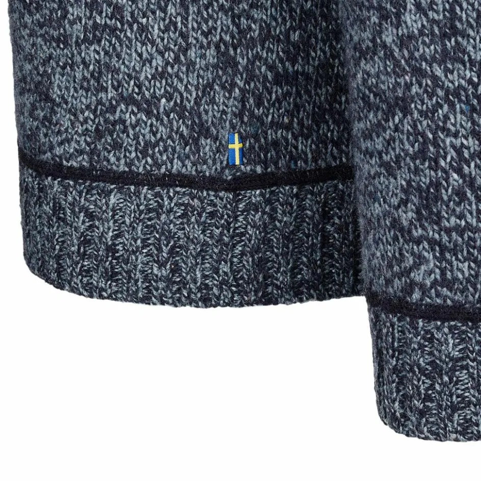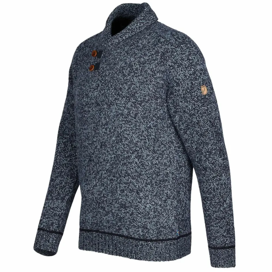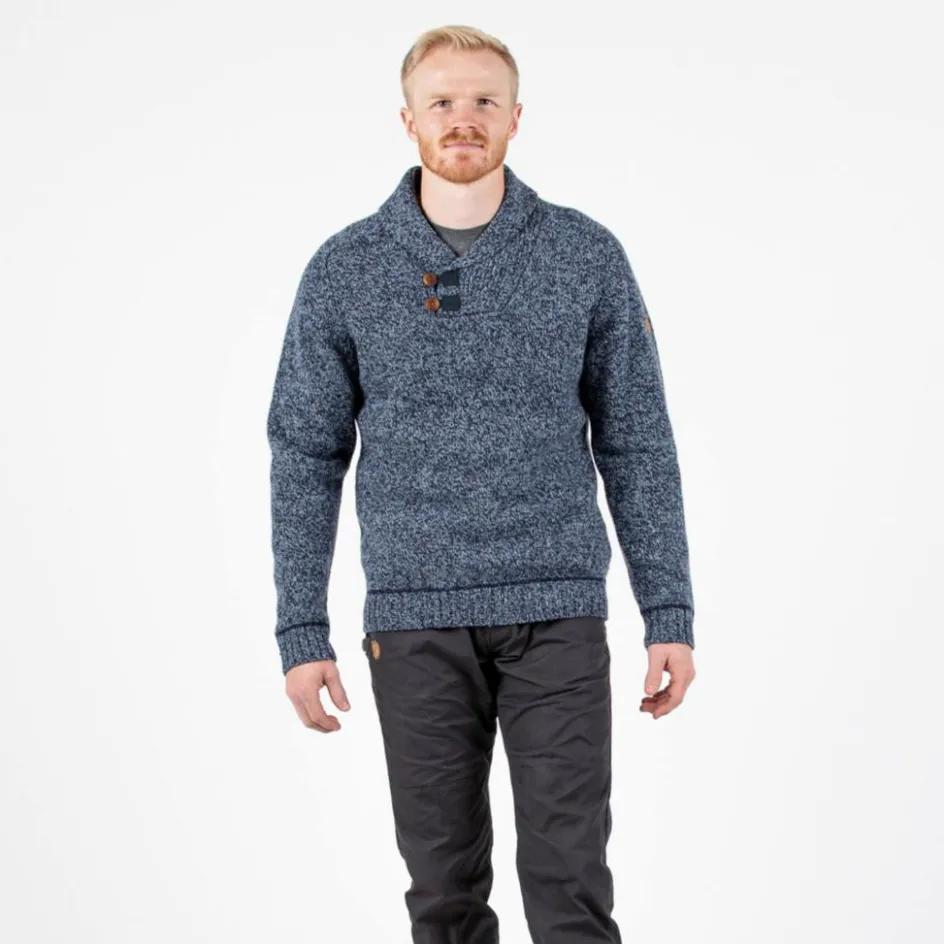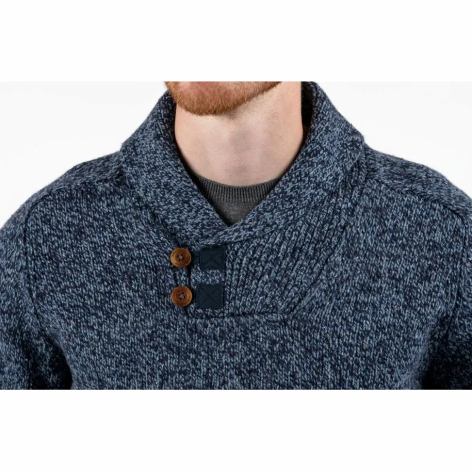 Der Lada Sweater ist ein klassischer Strickpullover aus weichem Lammwollgemisch. Er hat einen schmeichelnden Schalkragen, der vorne mit zwei Knöpfen aus Steinnuss geschlossen wird.