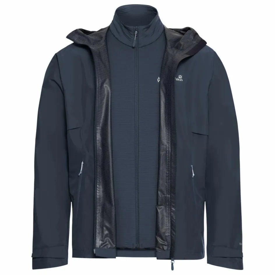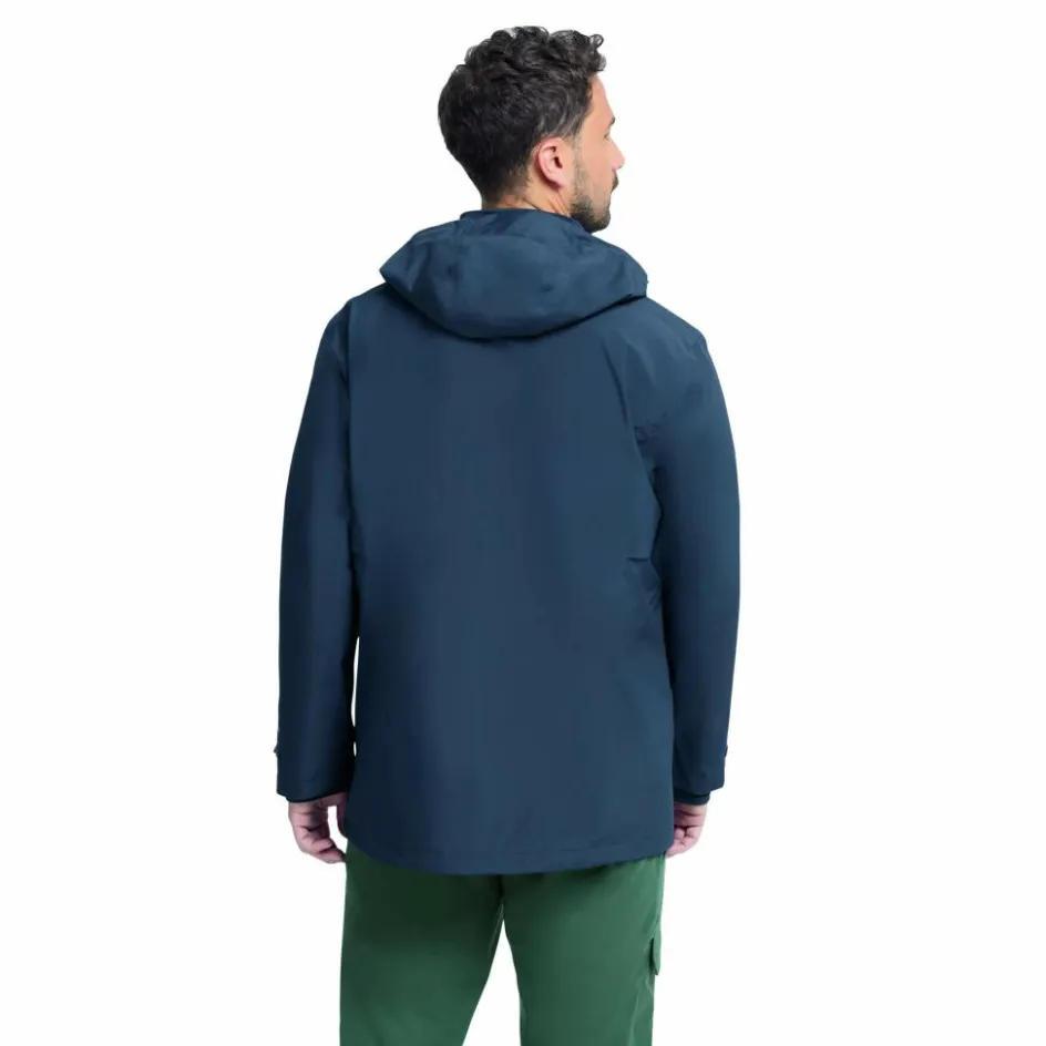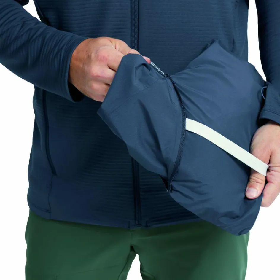 Dass du bei Regen trocken bleibst, dafür sorgt zum einen das wasserdichte, recycelte Material der Außenjacke. Zum anderen kannst du die Ärmelabschlüsse und den Saum so anpassen, dass sie körpernah sitzen und der Regen nicht ungewollt hineinfließt. Auch plötzlich aufkommenden Wind hält die Doppeljacke dir mit ihren winddichten Fähigkeiten vom Leib. Gleichzeitig ist sie atmungsaktiv, eine wichtige Eigenschaft, wenn du beim Berghochgehen ins Schwitzen gerätst.