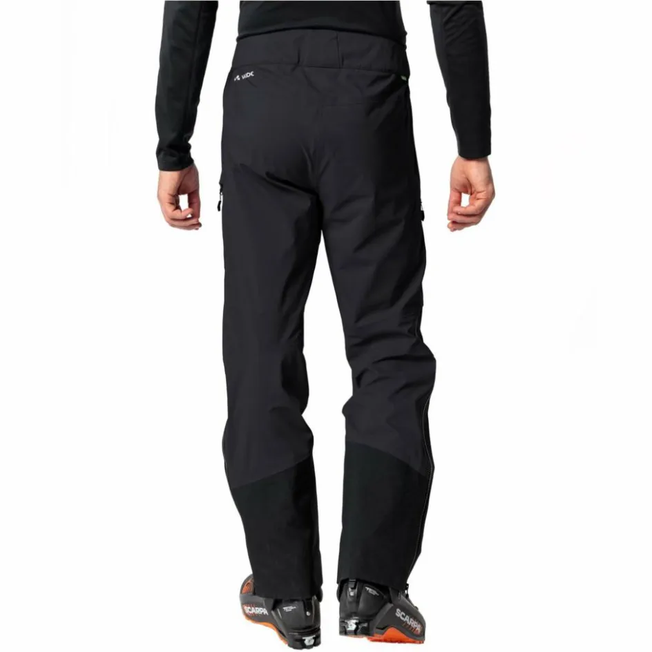 Der Bund ist weitenverstellbar und mit Gürtelschlaufen versehen, der Rückenteil etwas höher geschnitten, damit auch mit angezogenen Beinen am Fels oder in gebückter Haltung keine Kältebrücke entsteht. Die beiden Beintaschen mit wasserdichtem Reißverschluss verwahren Handy, Mütze oder den Müsliriegel und sind auch bei angezogenem Klettergurt gut erreichbar. Der Beinabschluss ist großzügig mit robustem, schnittfestem Material verstärkt, die Innengamaschen schützen vor eindringendem Pulverschnee bei der Abfahrt und die Verstellung am Beinabschluss passt über jeden Skitourenstiefel.
