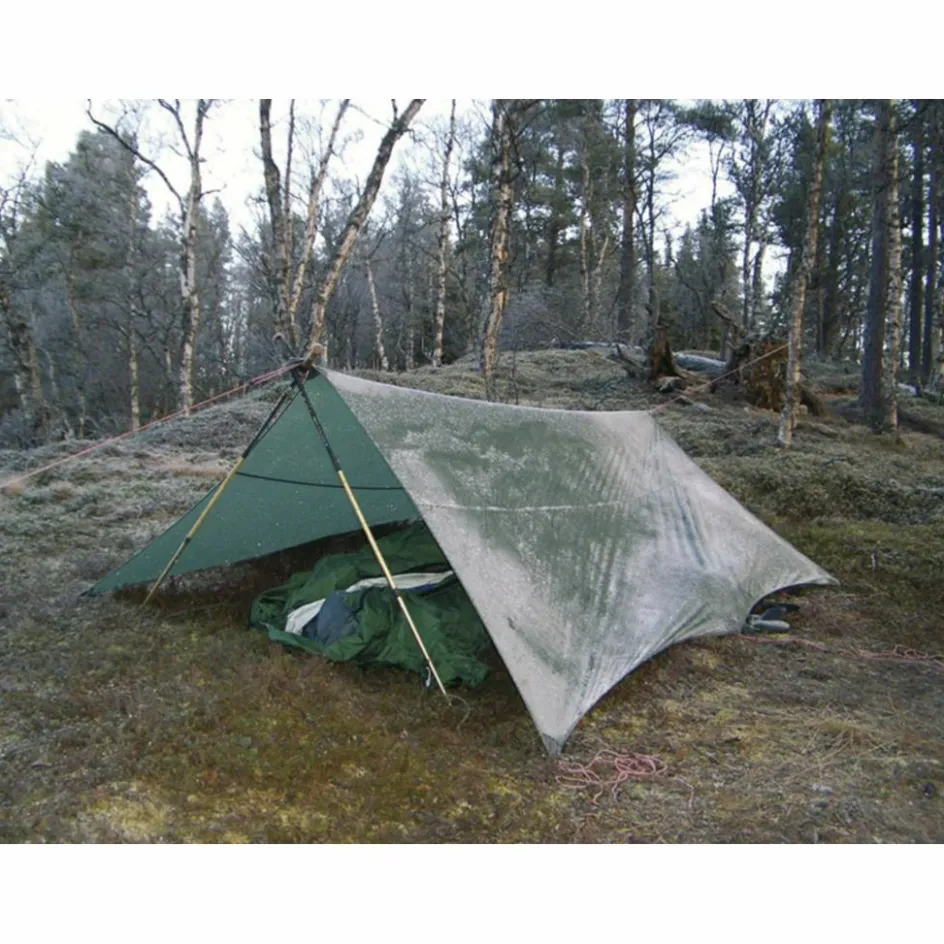 Das 70D Ripstop–Nylon besitzt eine Weiterreißfestigkeit von 25 kg und ist damit das robusteste Tarp in unserem Sortiment. Mit 350 x 290 cm kannst du es als vielseitige Übernachtungsmöglichkeit nutzen, aber auch als erweitertes Vorzelt. Es bietet dir dabei Schutz vor Wind, Regen und Schnee und kann an Bäumen oder mit Tarpstangen abgespannt werden.