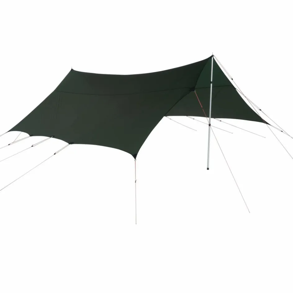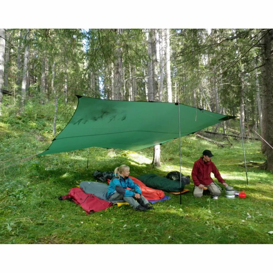 Praktisch für Gruppen und Familien. Du kannst dieses extrem leichte Tarp als Erweiterung fürs Zelt, als geschützten Basisplatz im Lager oder auch in vielen Variationen zum Übernachten nutzen.
