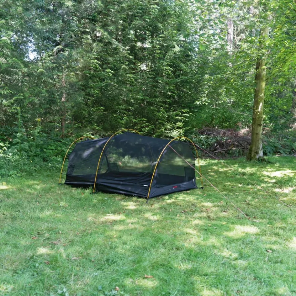 Auch besteht die Möglichkeit, dass du es mit dem separat erhältlichen Stangenhalter ohne Außenzelt aufbaust. In Kombination mit einem Tarp entsteht so eine luftige und dennoch wettergeschützte Unterkunft.