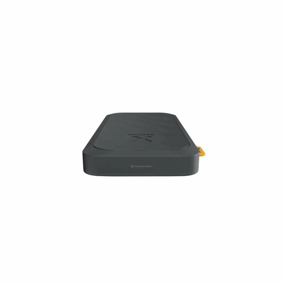 Das Gehäuse besteht größtenteils aus recyceltem Kunststoff und liegt dank der angenehmen Oberflächentextur gut in der Hand. Ein integriertes Digitaldisplay zeigt den Ladezustand der Powerbank präzise in Prozent an.