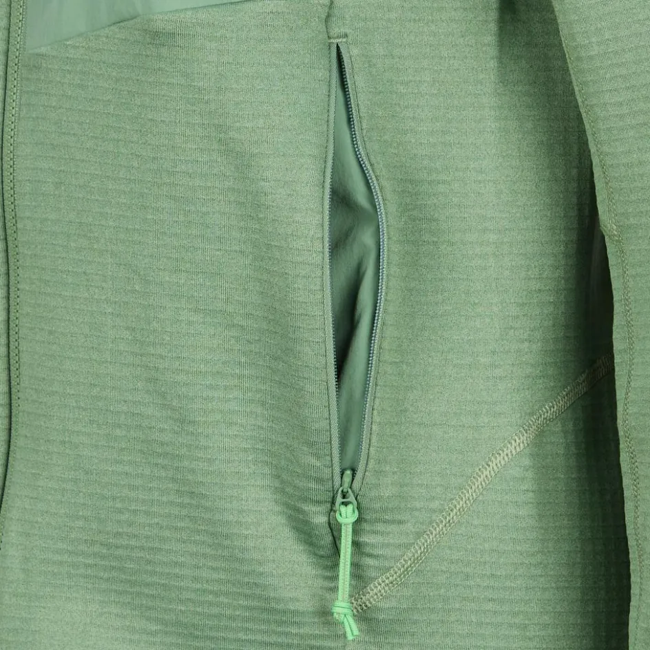 Außen ist das verwendete Grid-Fleece-Material glatt und weich, innen sorgt eine Waffelstruktur für ein sehr gutes Wärme-Gewichtsverhältnis und einen schnellen Abtransport von Körperfeuchtigkeit. Das elastische Material passt sich allen deinen Bewegungen an. Perfekt, wenn es im Eis oder am Fels richtig anstrengend wird.