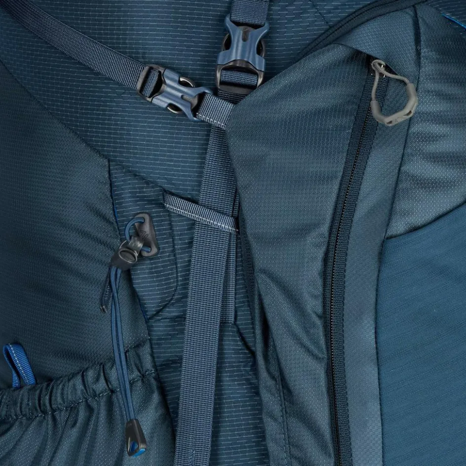Auf den ersten Blick fällt das Steckfach auf dem linken Schultergurt auf. Darin kannst du entweder deine Sonnenbrille griffbereit verstauen oder ein GPS-Notrufgerät wie das Garmin InReach Mini 2 (optional erhältlich). Das Frontfach wurde mit 420D Nylon verstärkt, sodass du dir beim Ablegen des Trekkingrucksacks keine allzu großen Gedanken um Abrieb machen musst. Auch das seitliche Steckfach besteht nun aus robustem Nylon und wurde zudem vergrößert. So eignet es sich perfekt für sperrige und scharfkantigere Gegenstände wie Zeltgestänge oder Trekkingstöcke.