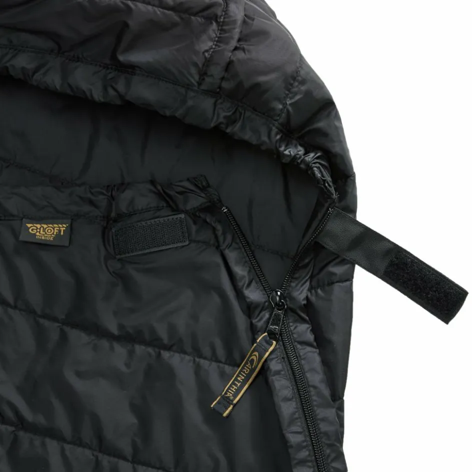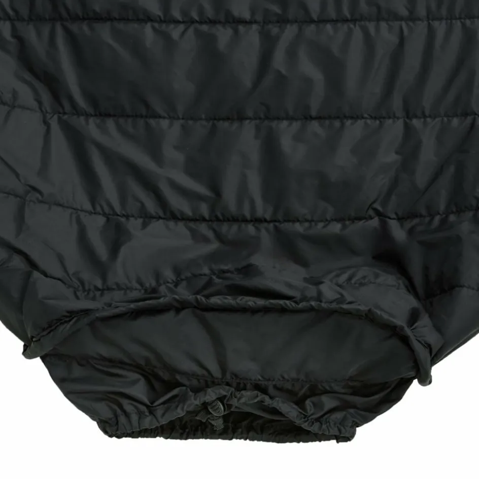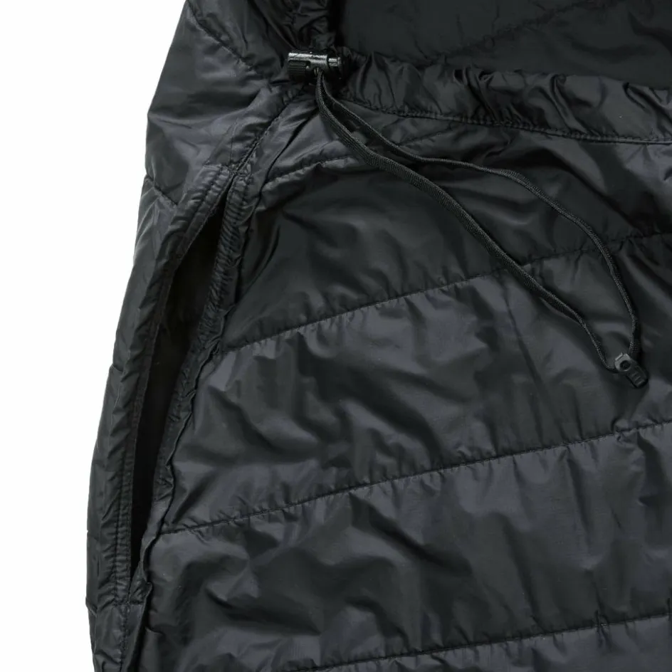 Der integrierte Packsack erlaubt auch das Verkürzen des Liners, indem das überstehende Fußstück in den Packsack gestopft und mit dem Kordelzug zugezogen wird. Dadurch müssen kleinere Personen kein unnötiges Luftvolumen erwärmen.