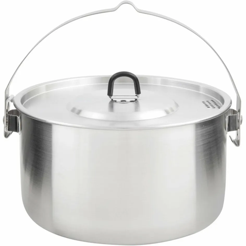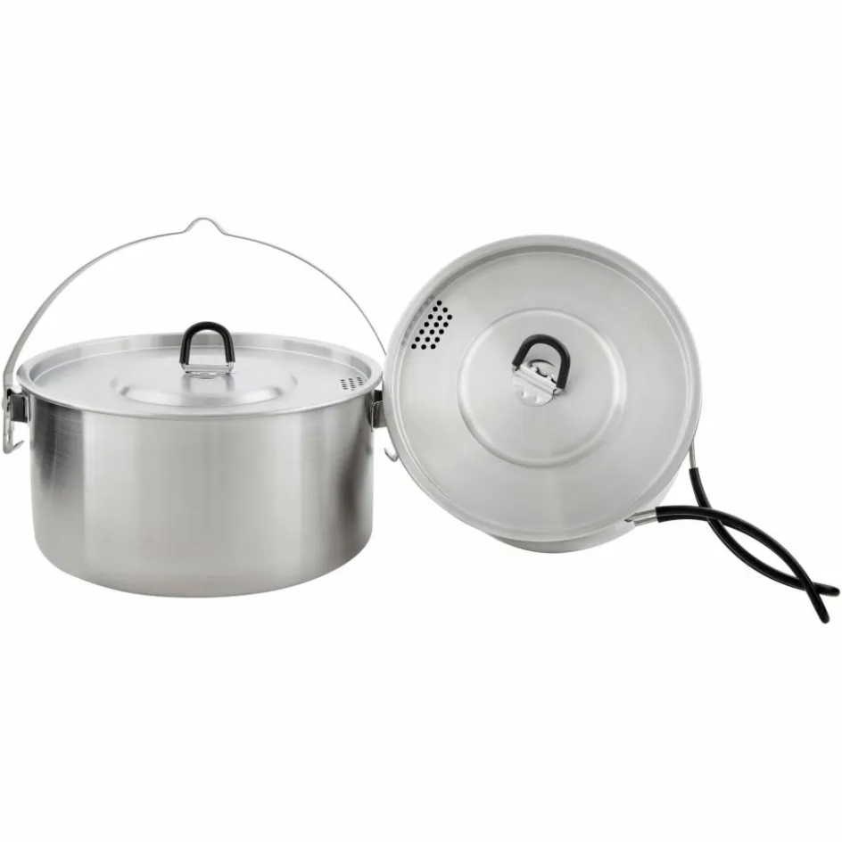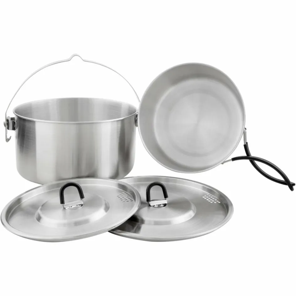 Der größere Topf verfügt über einen Henkel mit einer Aussparung, sodass er sicher über einem Lagerfeuer aufgehängt werden kann. Der kleinere Topf ist mit isolierten Klappgriffen ausgestattet, die eine sichere Handhabung ermöglichen. Beide Töpfe haben Deckel mit Klappgriffen und einer praktischen Siebfunktion, die das Abgießen von Flüssigkeiten erleichtert.