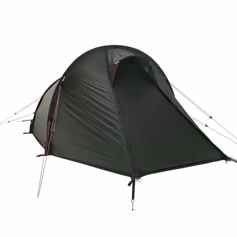 Tunnelzelt für drei Personen. Die abfallende Konstruktion und die perfekt abgestimmte Materialauswahl, macht es zu einem leichten und dennoch ganzjährig einsetzbarem Zelt.