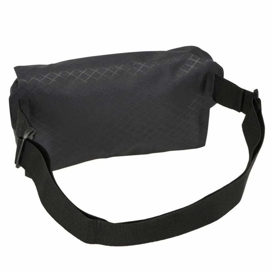 Das komplett schwarze Außenmaterial hat ein schickes und unauffälliges Rautenmuster. Die Ausstattung ist auf das Wesentliche reduziert. So lässt sich der Bauchgurt in der Länge verstellen, sodass die Tasche klassisch auf der Hüfte oder diagonal über dem Körper getragen werden kann. Das Hauptfach wird per Magnetverschluss geschlossen und hat den Vorteil, dass dieser sich sogar einhändig bedienen lässt. Im Hauptfach selbst befindet sich ein kleines RV-Fach.