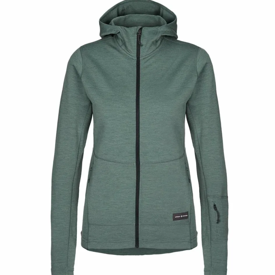 Der Hoodie ist aus Nuyarn hergestellt. Dabei handelt es sich um ein Garn aus feiner Merinowolle, die in einem besonderen Spinnverfahren mit einem Kern aus Nylon versehen wurde. Nuyarn trocknet fünfmal schneller als reine Merinowolle, ist sehr strapazierfähig und hoch elastisch. Gleichzeitig blieben die feuchtigkeitsleitenden, temperaturregulierenden und geruchshemmenden Eigenschaften, die Wolle von Natur aus besitzt, erhalten. So sorgt der Hoodie bei verschiedenen Aktivitätsleveln für volle Bewegungsfreiheit und ein angenehmes Körperklima.