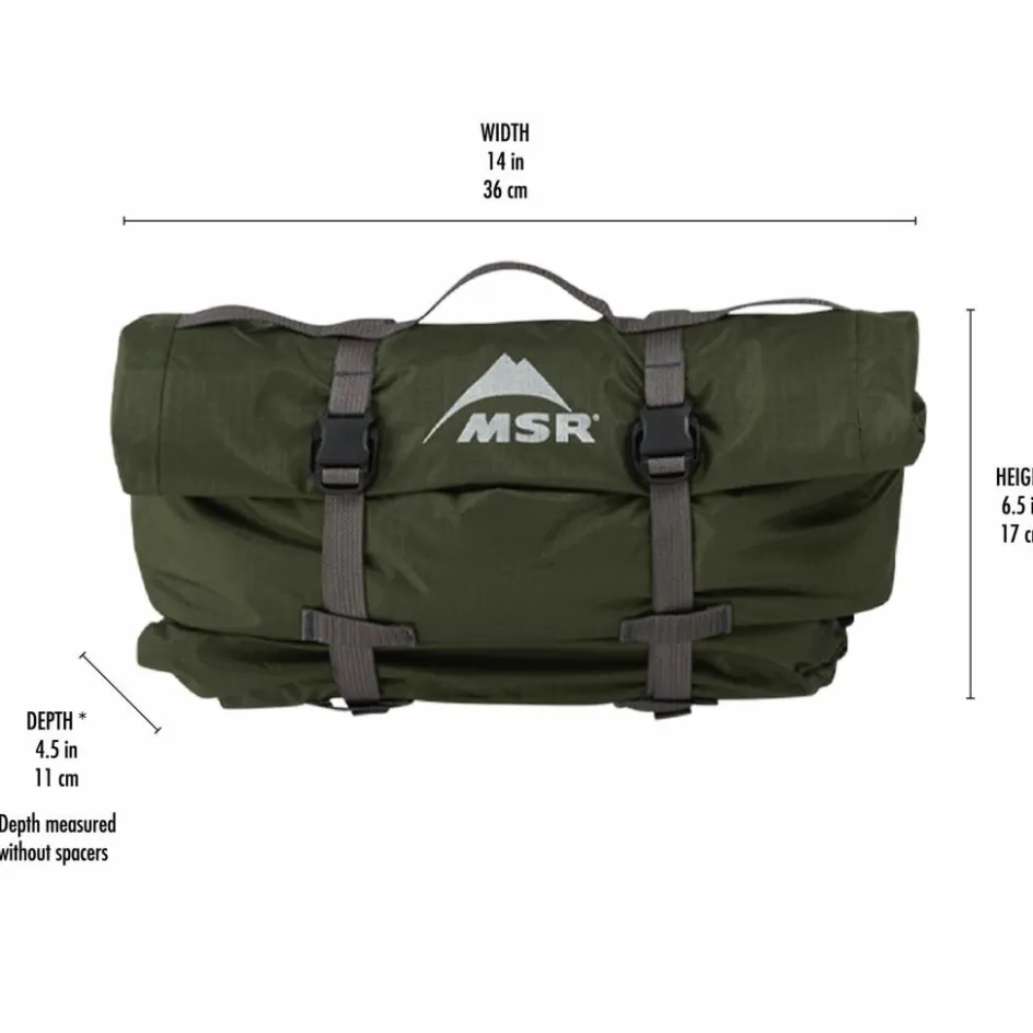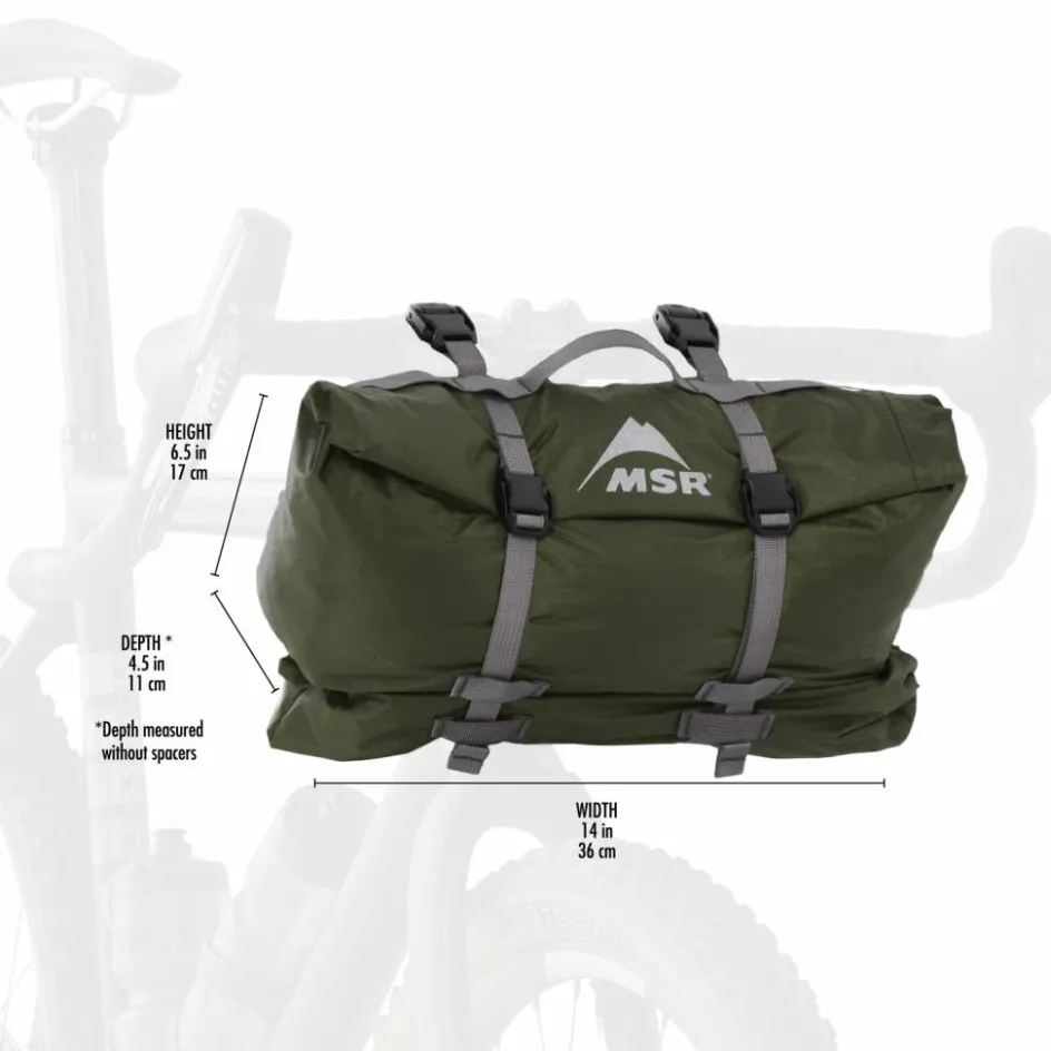 MSR hat dem Packsack besondere Aufmerksamkeit gewidmet. Dieser verfügt über einen Rollverschluss, der es ermöglicht, das Zelt stark zu komprimieren. Zwei Gurte und Halterungsblöcke erlauben eine direkte Befestigung am Lenker, was für einen sicheren Halt sorgt und den Kauf einer Lenkertasche überflüssig macht. Weitere Schlaufen am Packsack bieten die Möglichkeit, zusätzliche Ausrüstung zu befestigen.