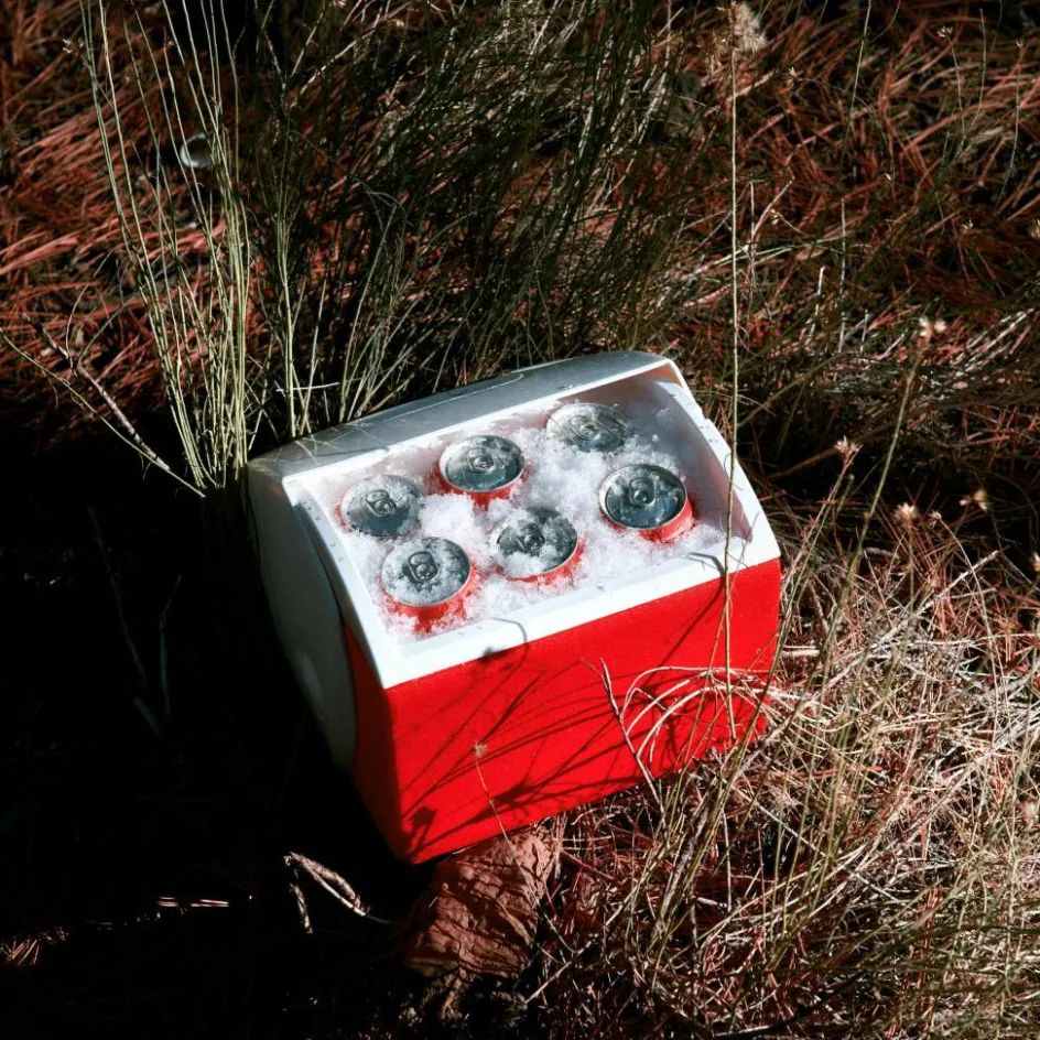 Geöffnet wird sie klassisch über den Seitenknopf, der die Verriegelung löst und den Deckel seitlich wegschwenken lässt. Diese kleine 6-l-Version eignet sich für Ausflüge an den Strand oder zur nächsten Party und fasst ca. sechs Getränkedosen mit je 0,3 l sowie einen Schwung Eis zur Kühlung.