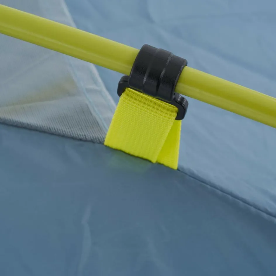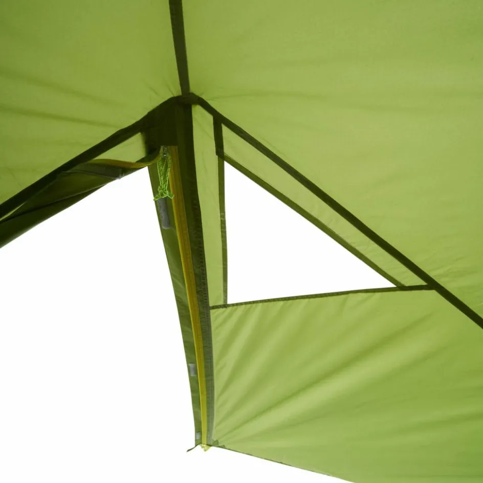 Belüftet wird das Kuppelzelt über die beiden aufstellbaren Hochlüfter, die mit einer Regenschutzleiste versehen sind. So kann der Wind die Regentropfen nicht durch den Lüfter ins Zelt drücken. Ist der Abend besonders mild oder sehr warm, kannst du das Außenzelt auch weglassen und nur das Innenzelt aufstellen. Die großflächigen Meshflächen in den Eingangstüren können dabei für mehr Privatsphäre abgedeckt werden.