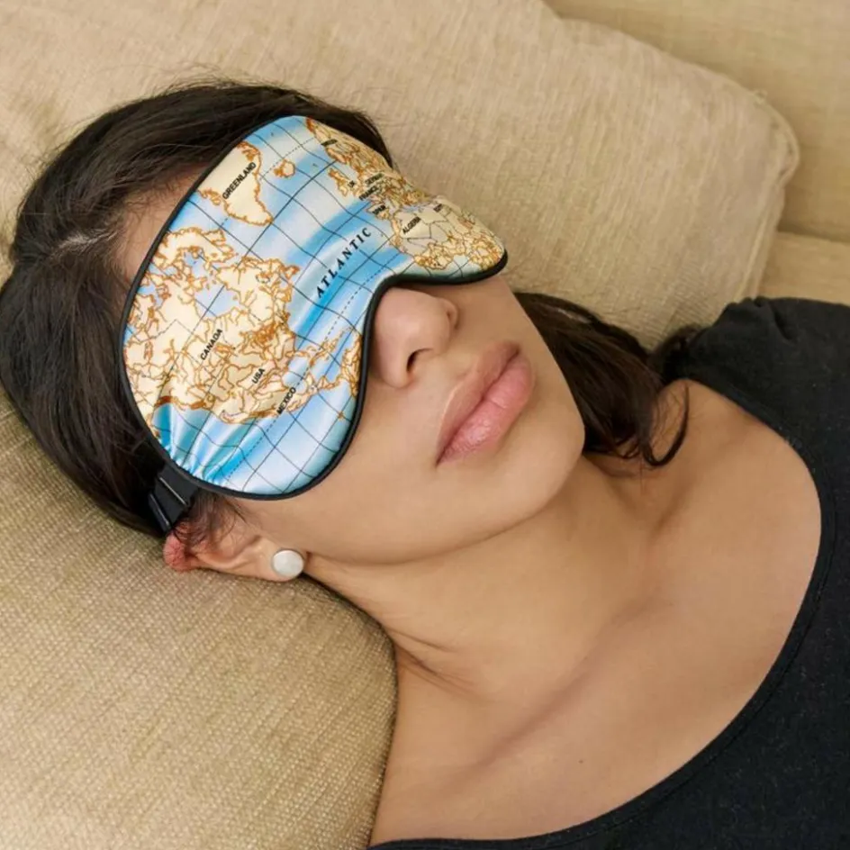 Weiche Schlafbrille mit elastischem Band und dekorativem Weltkarten-Design; so kannst du auf der Fahrt oder dem Flug schon mal entspannt vom Zielort träumen.