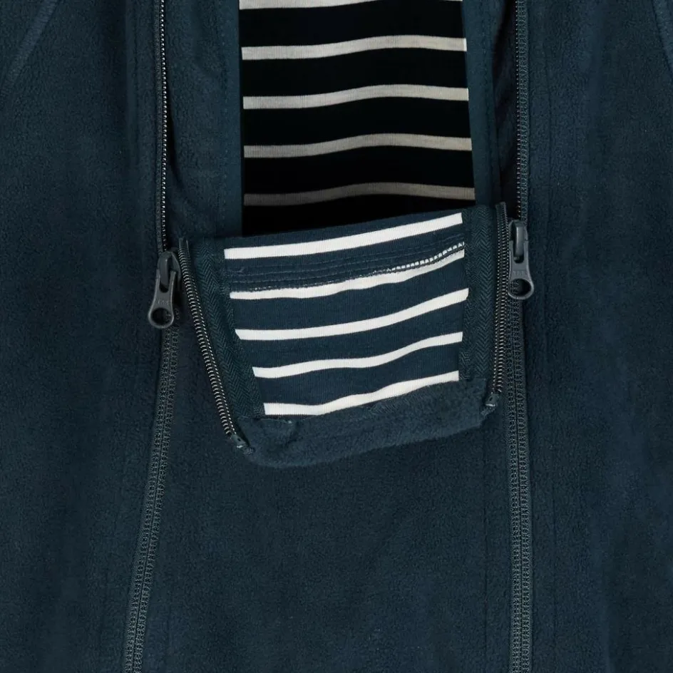 Der Stratus Overall aus recyceltem Polyester ist atmungsaktiv und mit gemütlichem, gestreiften Trikot aus 100 % Bio-Baumwolle gefüttert. Der Overall hat eine abnehmbare Kapuze mit Druckknöpfen und doppelte Reißverschlüsse an der Vorderseite, die das An- und Ausziehen erleichtern. Die Reißverschlüsse sind mit einer inwendigen Windschutzleiste ausgestattet, die vor kaltem Wind schützt. Ein Kinnschutz am oberen Ende verhindert unangenehmes Kratzen an Hals und Wangen.
