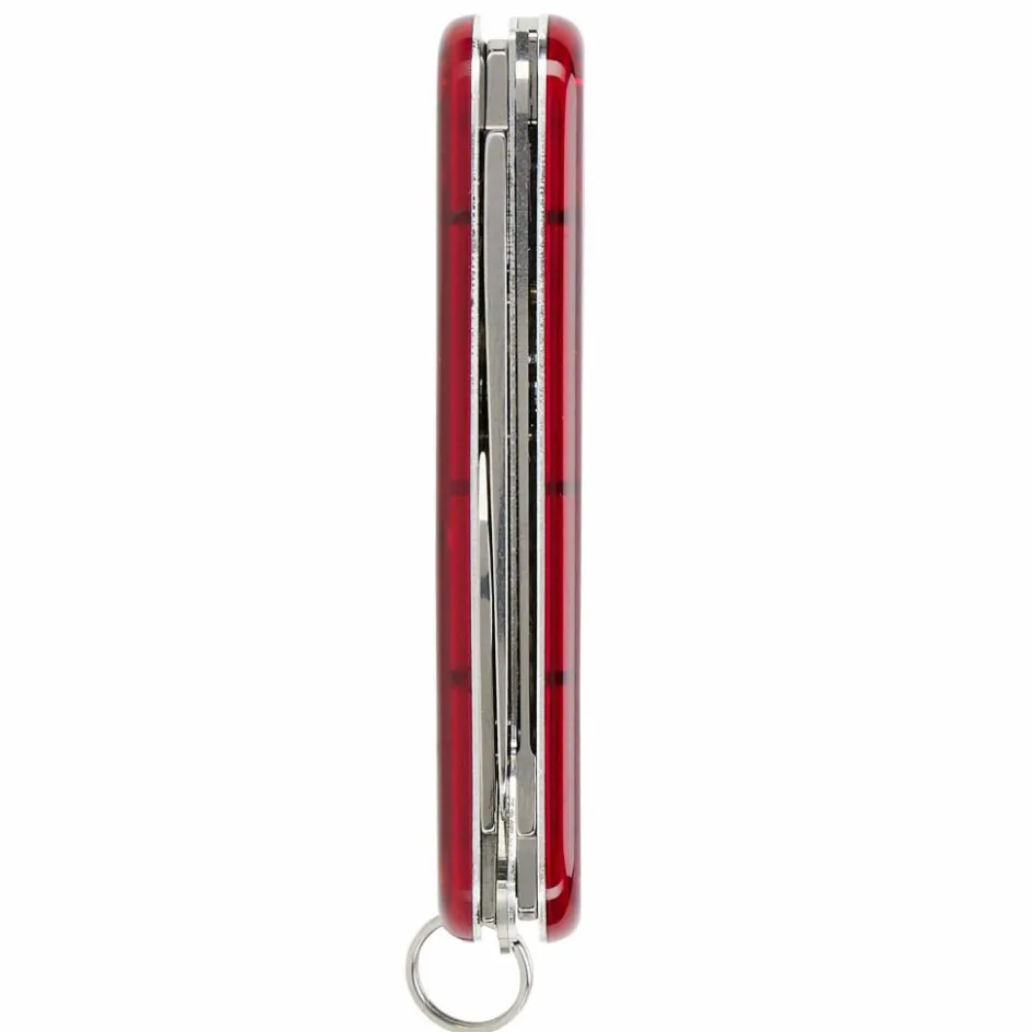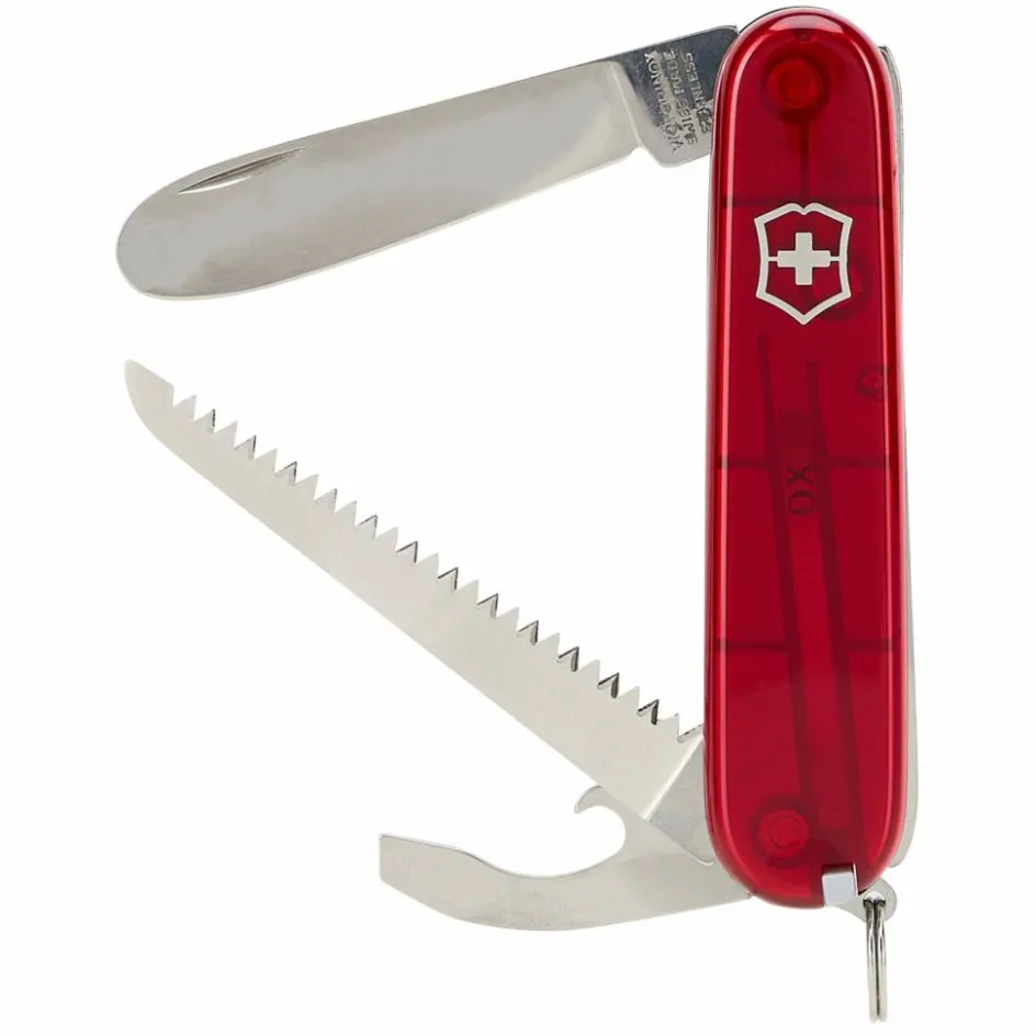 In diesem Taschenmesser steckt eine (abgerundete) Klinge zum Stullen schmieren, eine Holzsäge, die Kombiklinge (Kapselheber, Dosenöffner, Schraubendreher, Drahtbieger) und eine Pinzette.