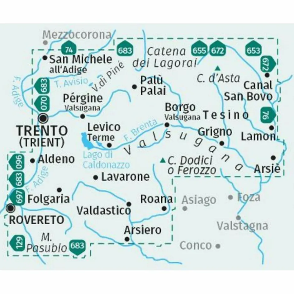 Ausstattung der Wanderkarte Valsugana, Pine, Levico, Lavarone, Folgaria, Monte Pasubio, Cima d’Asta, Lagorai, Tesino: