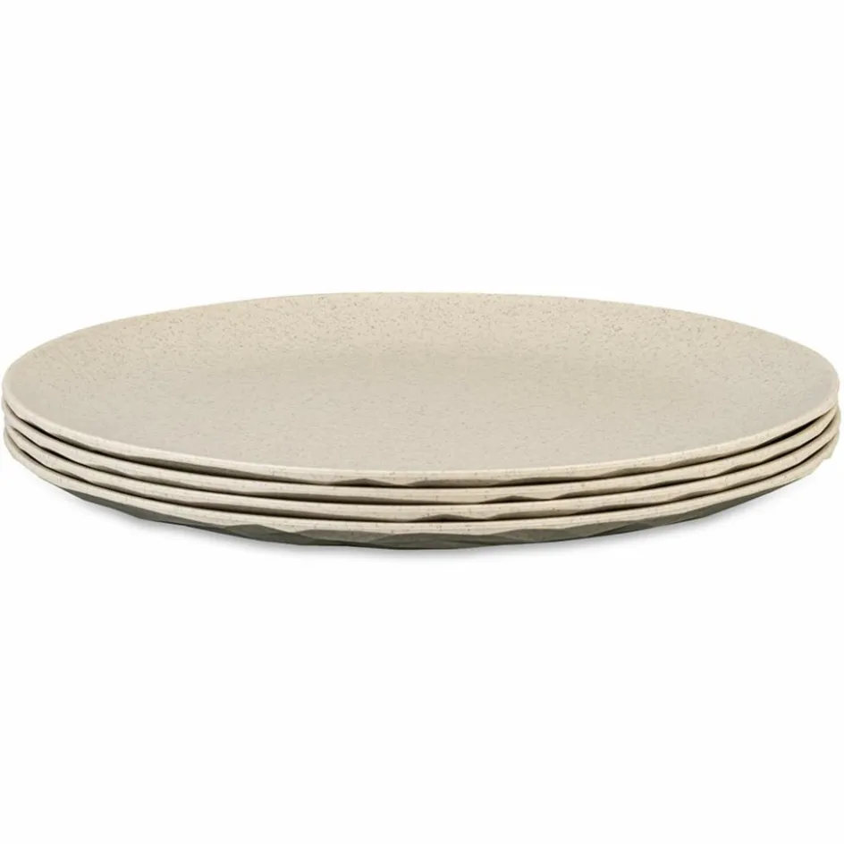 Dieses Set besteht aus vier Speisetellern mit je 26 cm Durchmesser. Hergestellt aus schwerem, bruchsicherem und biobasiertem Kunststoff in facettiertem Design.