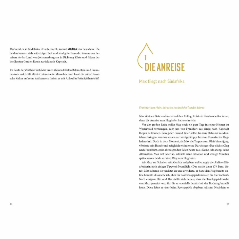 In Südafrika erwarten einen viele Überraschungen und Missverständnisse. Von der Frage nach der Sprache bis zu unerklärlichen Blicken der Polizisten – jedes Fettnäpfchen birgt eine neue Entdeckung. Der abenteuerliche Trip führt durch Kapstadt, die Karoo und Johannesburg und lässt einen die vielfältigen Kulturen und Eigenheiten des Landes auf humorvolle Weise erleben.