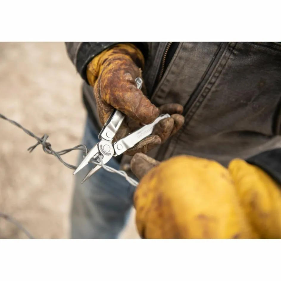 Aufgabe war es, ein Multitool zu schaffen, das die 14 wichtigsten Werkzeuge in einem kompakten Tool zusammenführt. Neben einer 7,4 cm langen 420-HC-Klinge befinden sich auch Kreuz- und Schlitzschraubendreher im Griff und natürlich eine kräftige Spitzzange mit Drahtschneider. Alle Tools sind innenliegend und die Klinge mit einem Nagelhau zu öffnen. Transportieren kannst du es zugriffsbereit im Nylonholster, das am Gürtel oder Rucksack befestigt werden kann. Damit ist es jederzeit griffbereit, wenn Arbeiten anstehen.