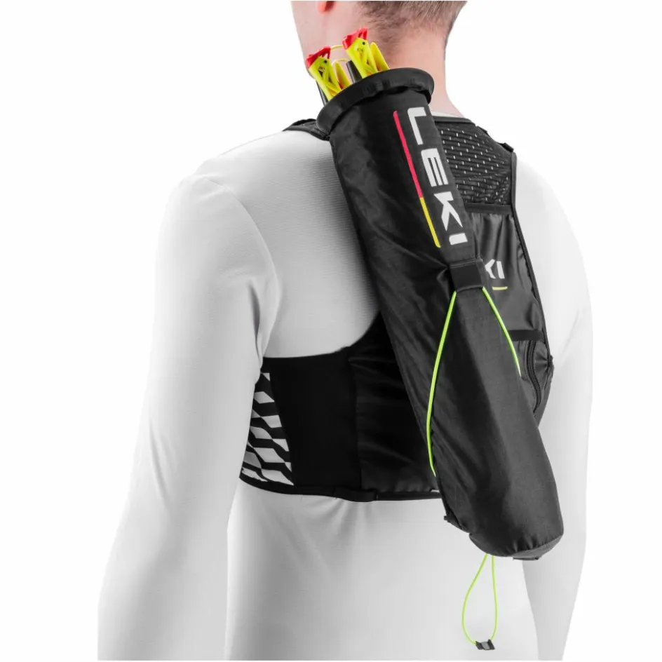 Die atmungsaktive und leichte Weste passt sich perfekt an jede Körperform an. Der Quiver/Köcher kann schnell und einfach in das dafür vorgesehene Befestigungssystem der Weste eingehakt werden. Der Quiver passt sowohl für die Leki Superlite-Modelle mit 14 mm Durchmesser als auch für Modelle mit 16 mm Durchmesser.
