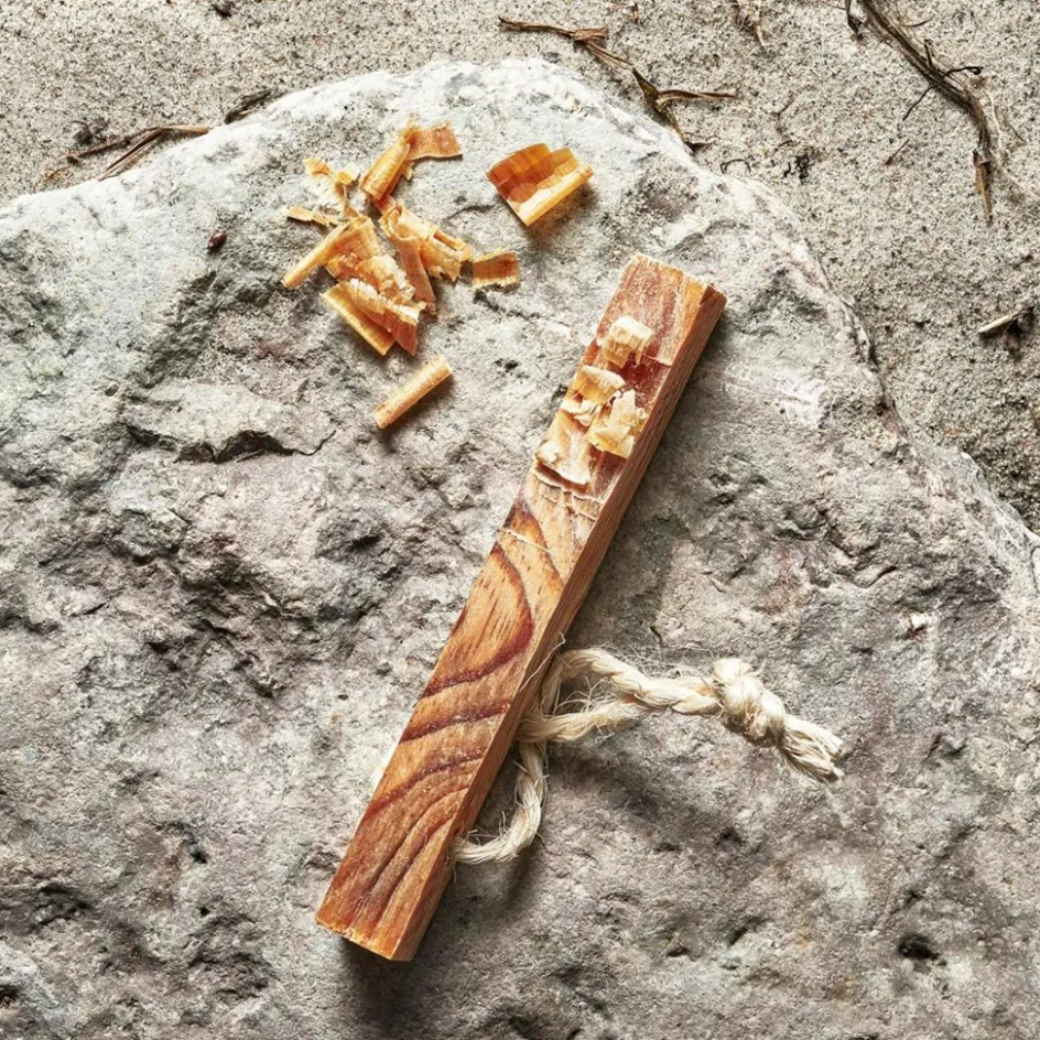 Mit der praktischen Kordel kannst du das Holz am Rucksack oder Gürtel befestigen. So ist es immer griffbereit, wenn du es brauchst. Auch im Flugzeug kannst du es im Rucksack transportieren, da es nicht als Gefahrgut eingestuft ist.