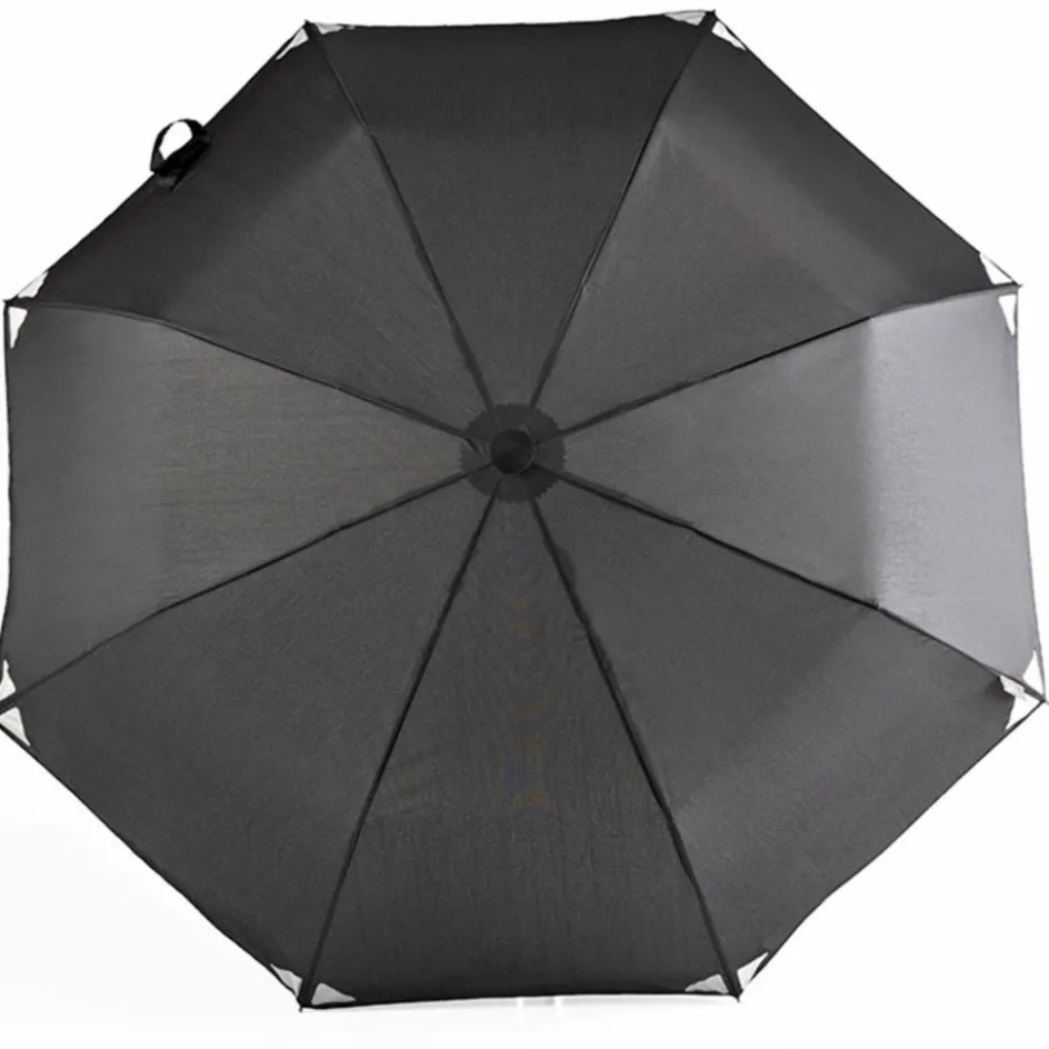 Klein zusammenfaltbarer Schirm für Reisen und Alltag. Der Schirm besitzt an jedem Segment stark reflektierende Elemente. Das sieht nicht nur gut aus, sondern schafft auch Sicherheit im Straßenverkehr.
