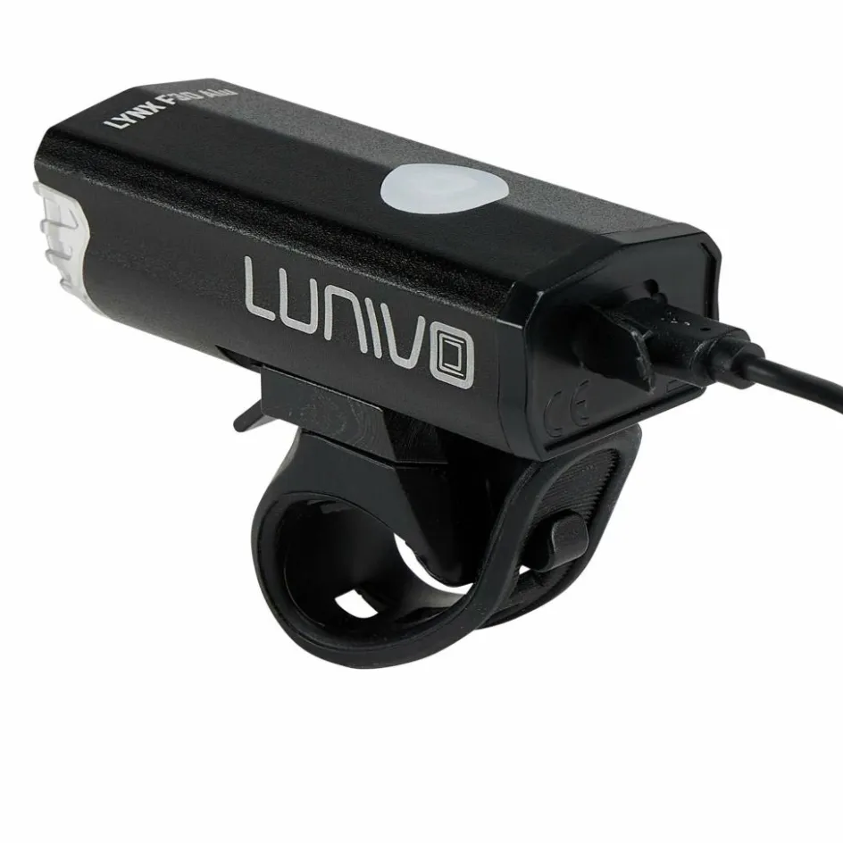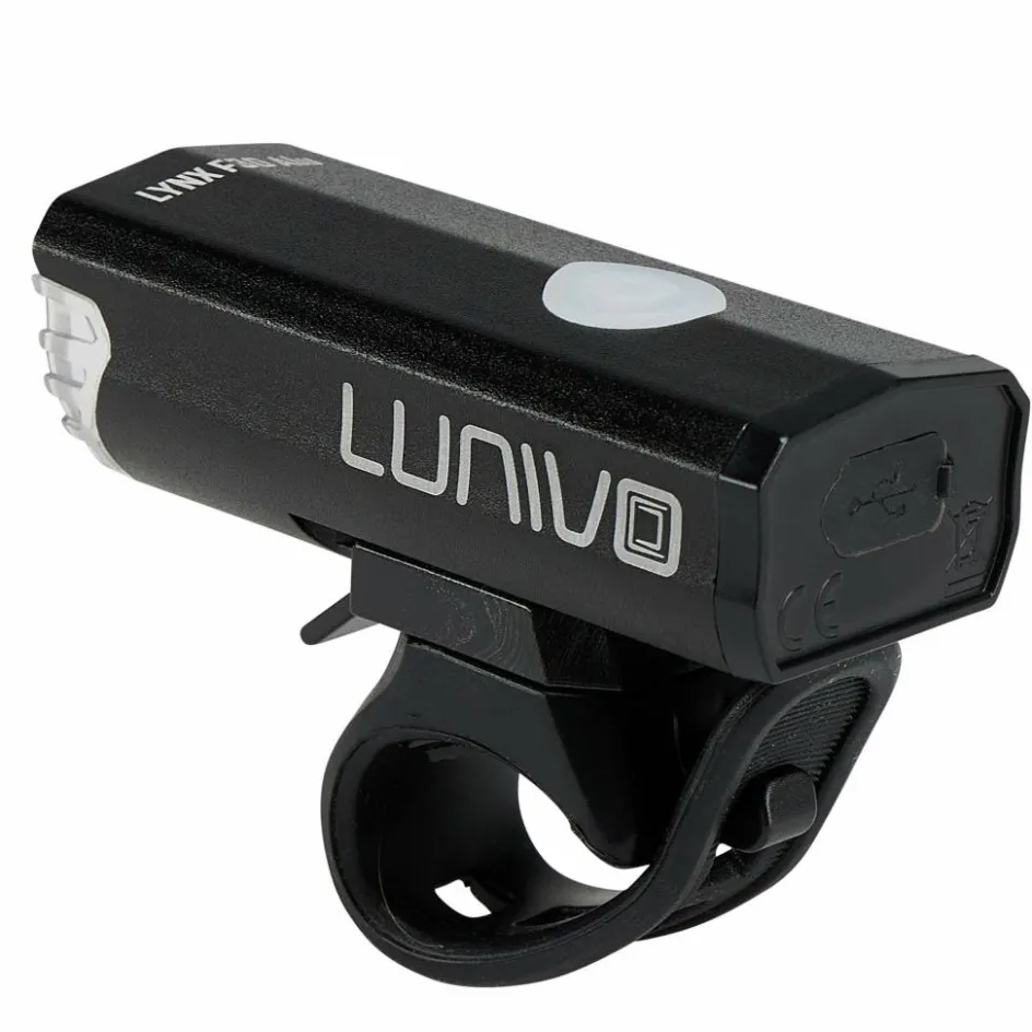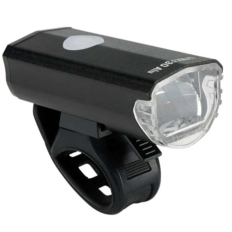 Der kompakte Lynx F30 Alu Frontscheinwerfer liefert dir eine Lichtausbeute bis 30 Lux. Geht es hauptsächlich ums Gesehen-Werden im städtischen Bereich (und nicht so sehr ums wirkungsvolle Weg-Ausleuchten), lässt sich die Intensität der Lampe auch herunterregeln. Bis zu 10 Stunden Leuchtdauer mit 15 Lux stehen dir dann zur Verfügung. An- und Ausschalten geht über den präsenten Knopf auf der Oberseite, der dir auch anzeigt, wenn es wieder Zeit ist, den Akku wieder aufzuladen. Solltest du trotz alledem mal vergessen, den Lynx F30 Alu mal auszuschalten: Eine automatische Abschaltung mit Sensor sorgt dafür, dass nach 4 Minuten ohne Bewegung die Lampe ausgeschaltet und der Akku geschont wird.