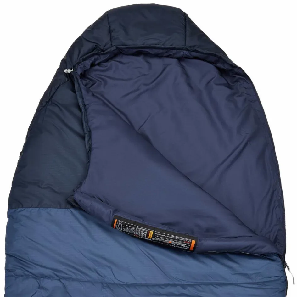 Innen wird es ebenfalls zügig warm. Denn das weich aufgebürstete Material erwärmt sich schnell und fühlt sich angenehm auf der Haut an. Ein einfacher Kordelzug im Halsbereich zieht den Schlafsack bei Bedarf enger, damit keine wertvolle Wärme verloren geht. In wärmeren Nächten kannst du den 2-Wege-Reißverschluss von unten öffnen und für etwas Belüftung sorgen. Wird es dennoch zu warm, kann der Schlafsack bis zu den Waden geöffnet werden.