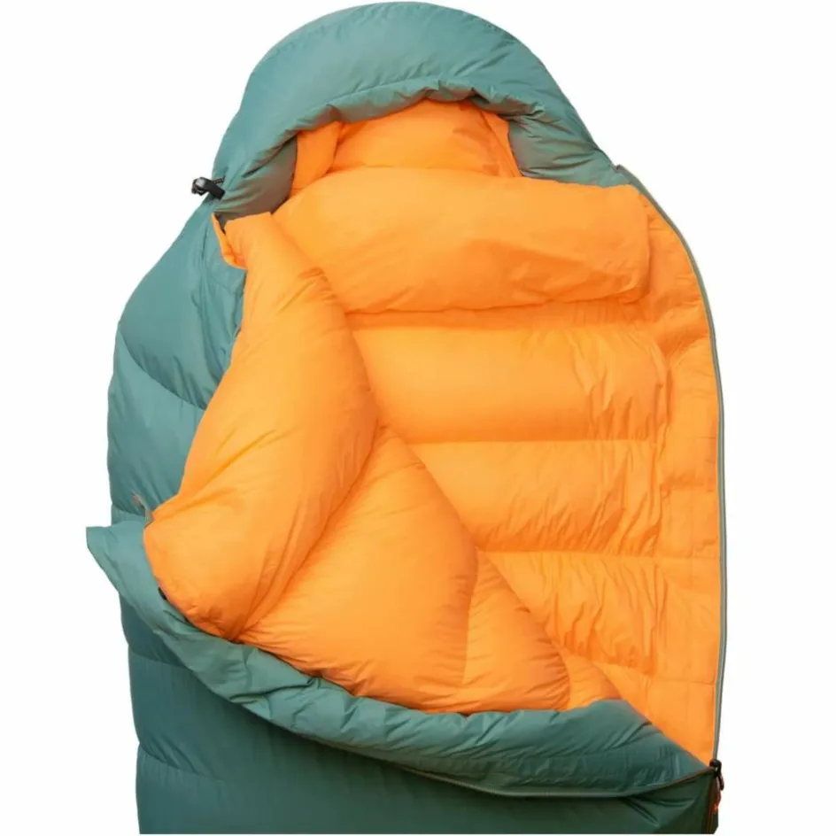 Dank seiner Füllung aus 950 g Down Codex zertifizierter Entendaune mit mindestens 700 cuin Fillpower und dem leichten, wasserabweisenden 30 Denier Drilite Loft Außenmaterial aus recyceltem Polyamid ist der Schlafsack ausgesprochen warm. Das Innenmaterial ist ebenfalls zu 100% recycelt. Wechselhafte Bedingungen, Kondensfeuchtigkeit oder Schnee können ihm im Zelt oder in einer Schneehöhle nichts anhaben.