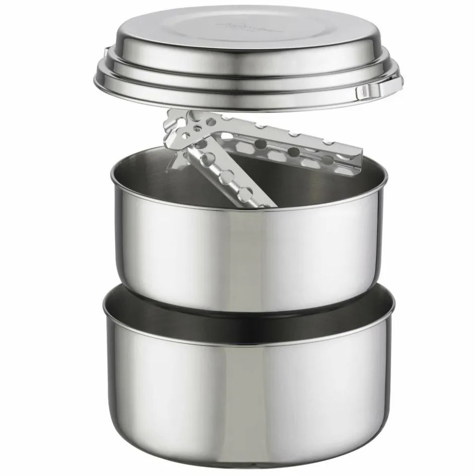 Ein nahezu unverwüstliches Topfset, das selbst häufige Einsätze nicht scheut. Hergestellt aus Edelstahl und für einen platzsparenden Transport ineinander stapelbar. Geeignet für zwei Personen.