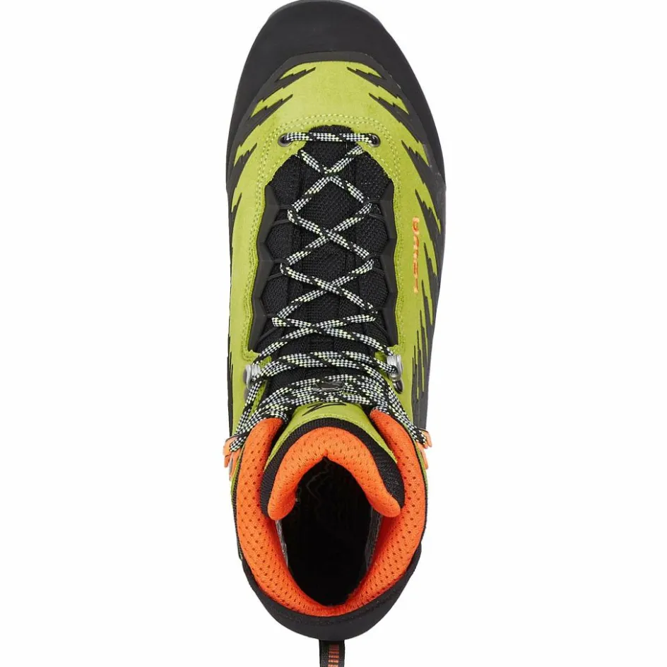 Der hochwertige Bergstiefel, der sich auch für harte Trekkintouren eignet, ist außerdem mit einer Steigeisenauflage im Fersenbereich ausgestattet, wodurch halbautomatische, aber auch Steigeisen mit Riemenbindung zum Einsatz kommen können. Das robuste Veloursleder, welches als Obermaterial zum Einsatz kommt, macht auch nicht schlapp, wenn es mit scharfkantigem Fels in Kontakt kommt.