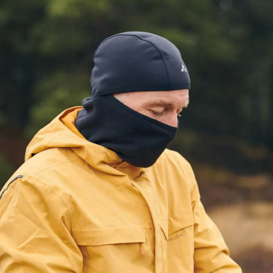 Gesichtsmaske in Hybridkonstruktion für kälteerprobte Alltagsradler und Radreisende. Im vorderen Mund-Nase-Bereich und im Mützenbereich kommt zum größten Teil recyceltes Softshell-Material zum Einsatz.